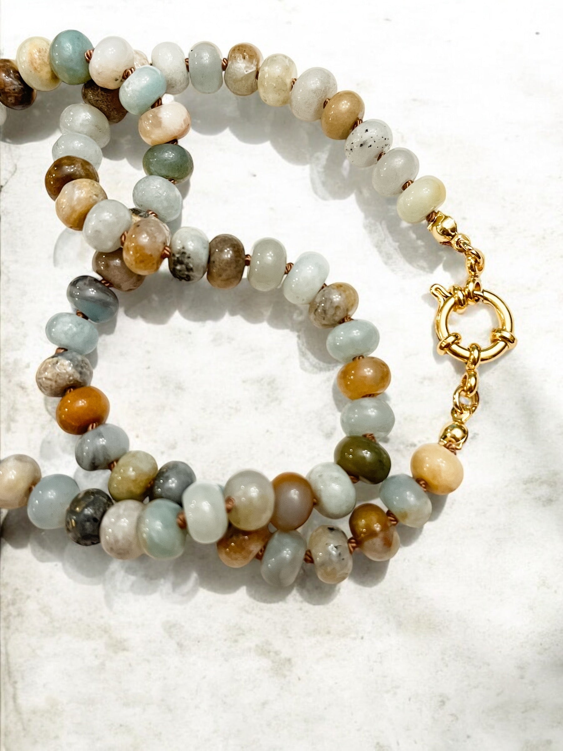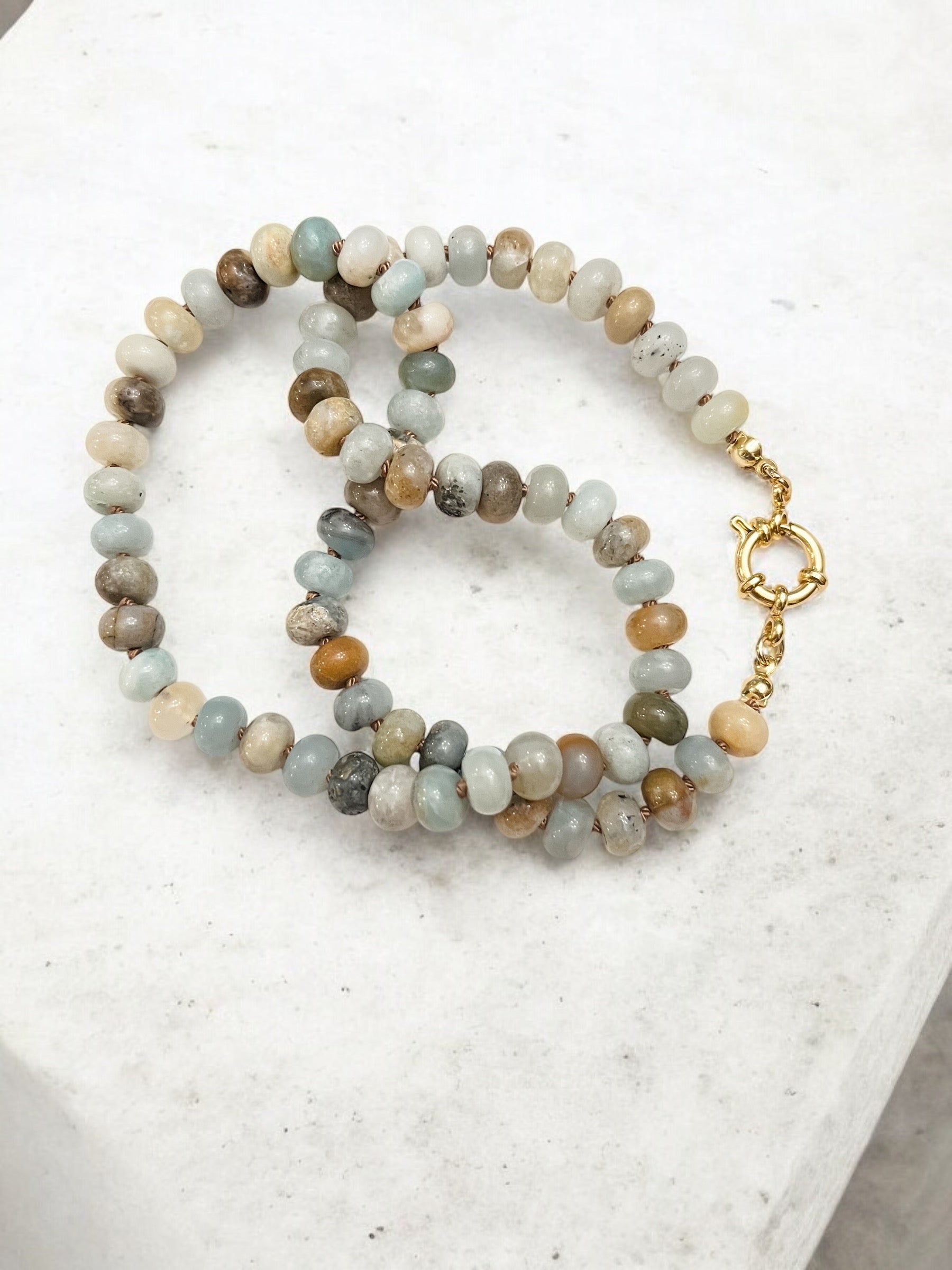 This earth tone necklace features a mix of gorgeous amazonite gemstone beads that are hand knotted onto a tan silk thread. The necklace comes together with a 18k gold decorative clasp that can be worn in the front, on the side or the back.