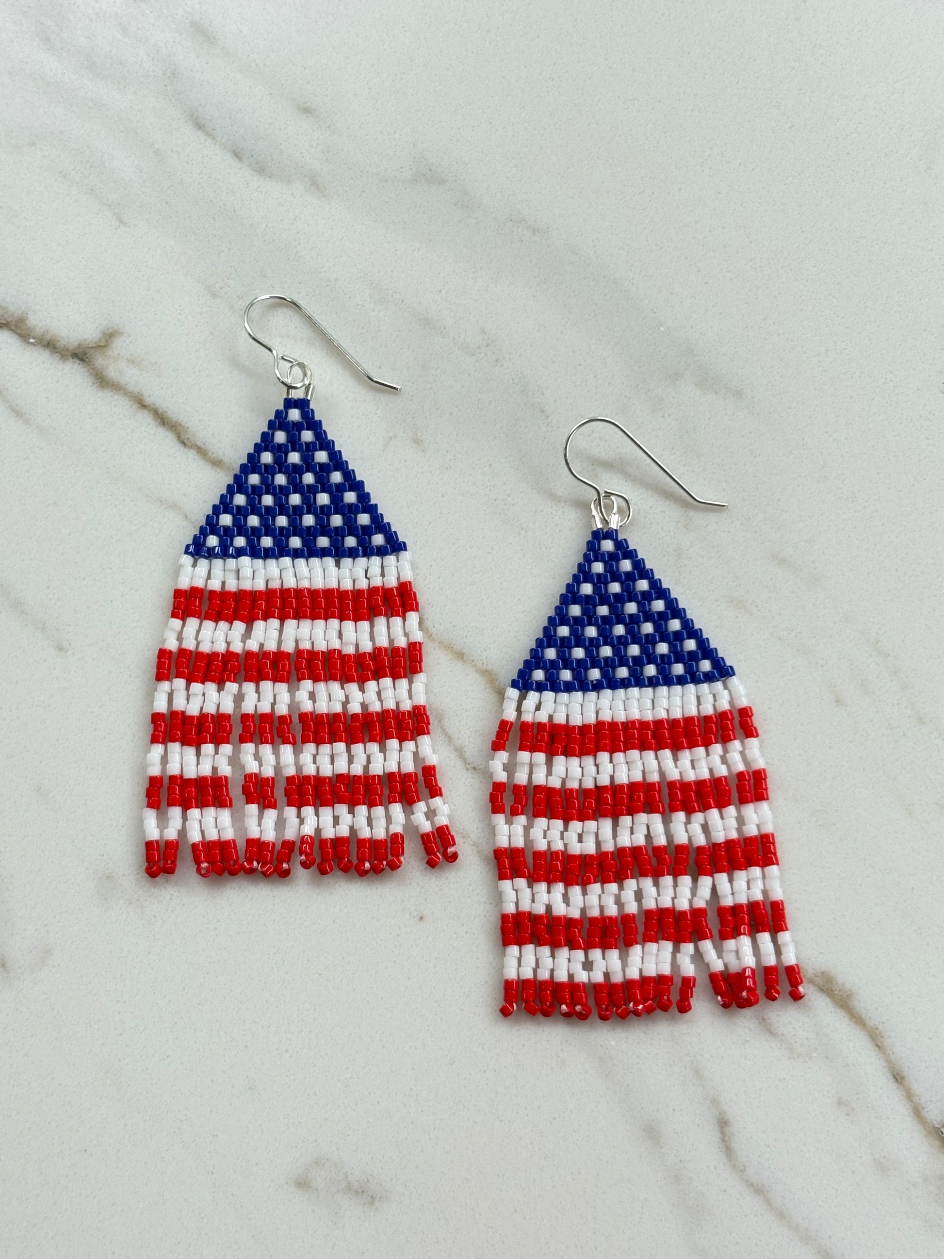Red, white and blue American flag beaded fringe earrings on a stainless steel silver hook. The length is approximately 3 inches.