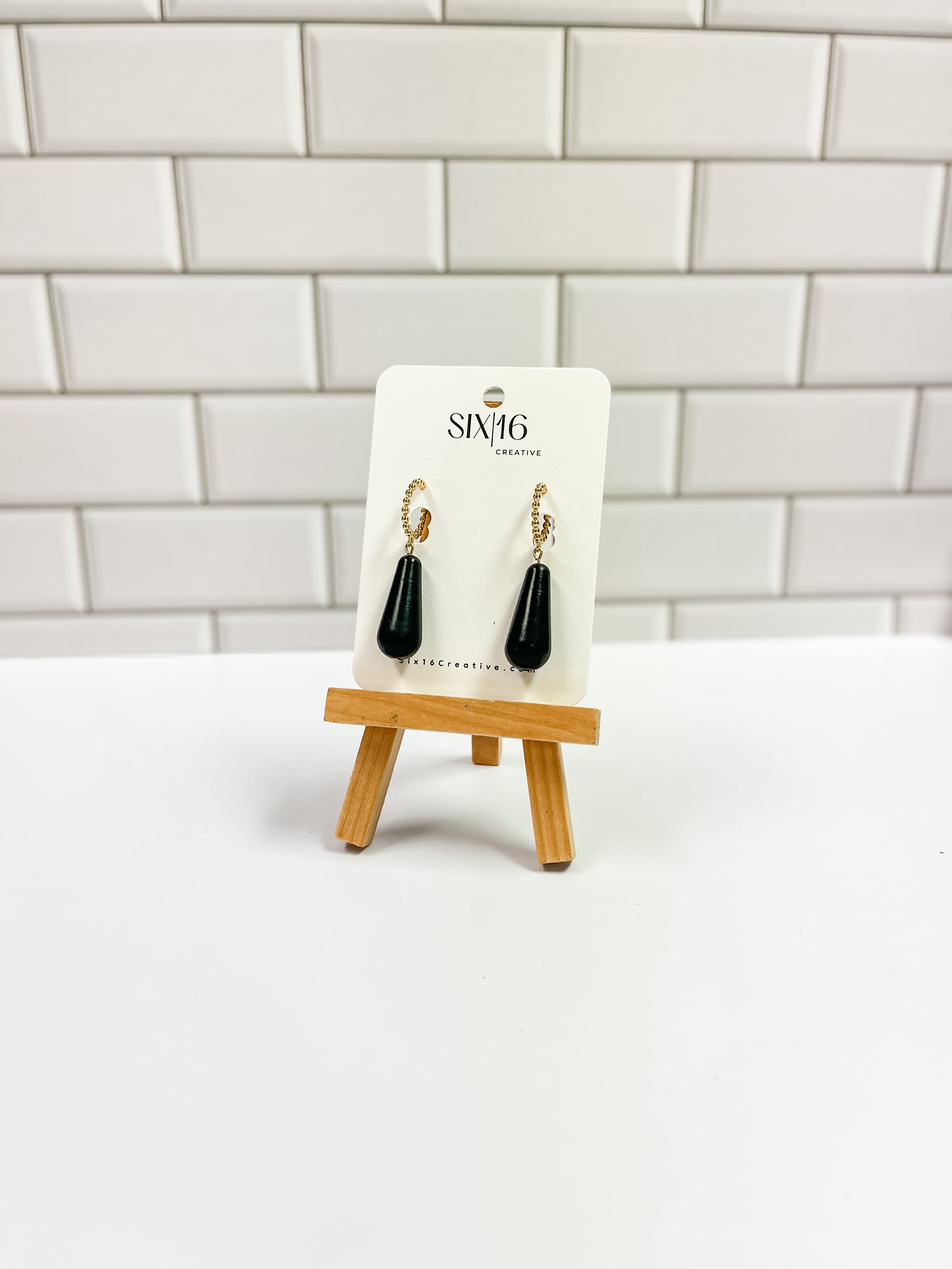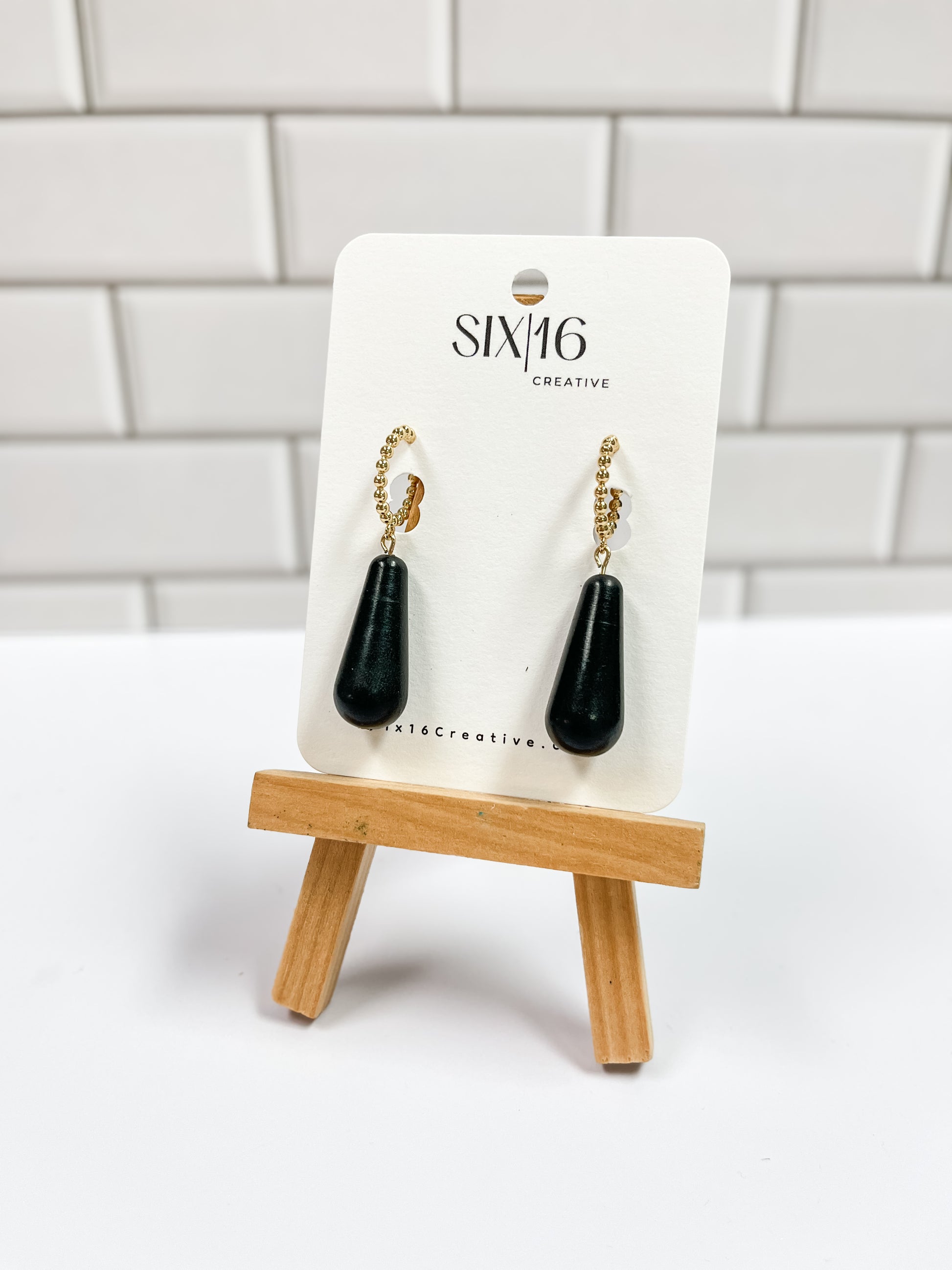 Black bead polymer clay earrings on an gold circle post. Earring length is approximately 2 inches.