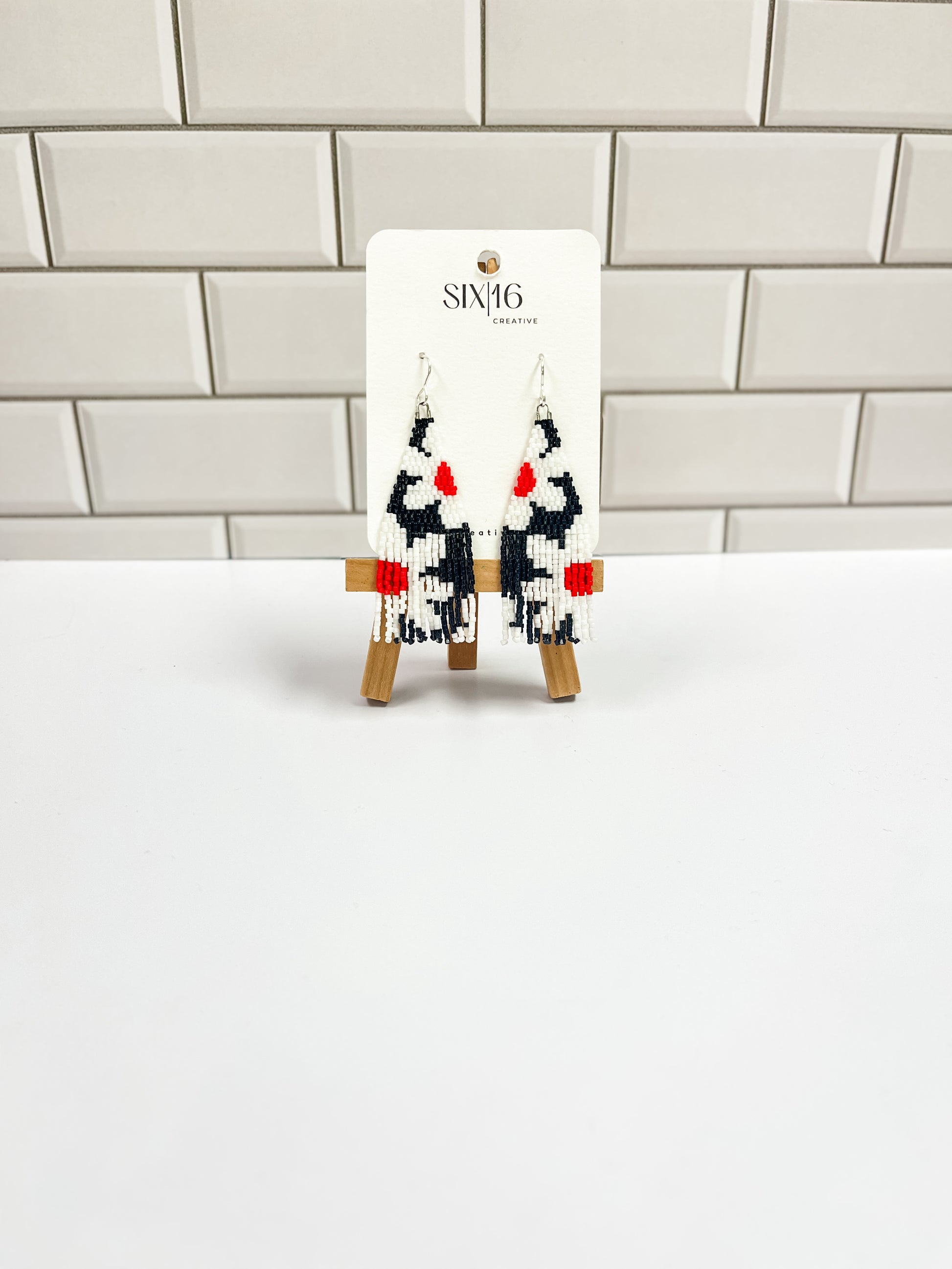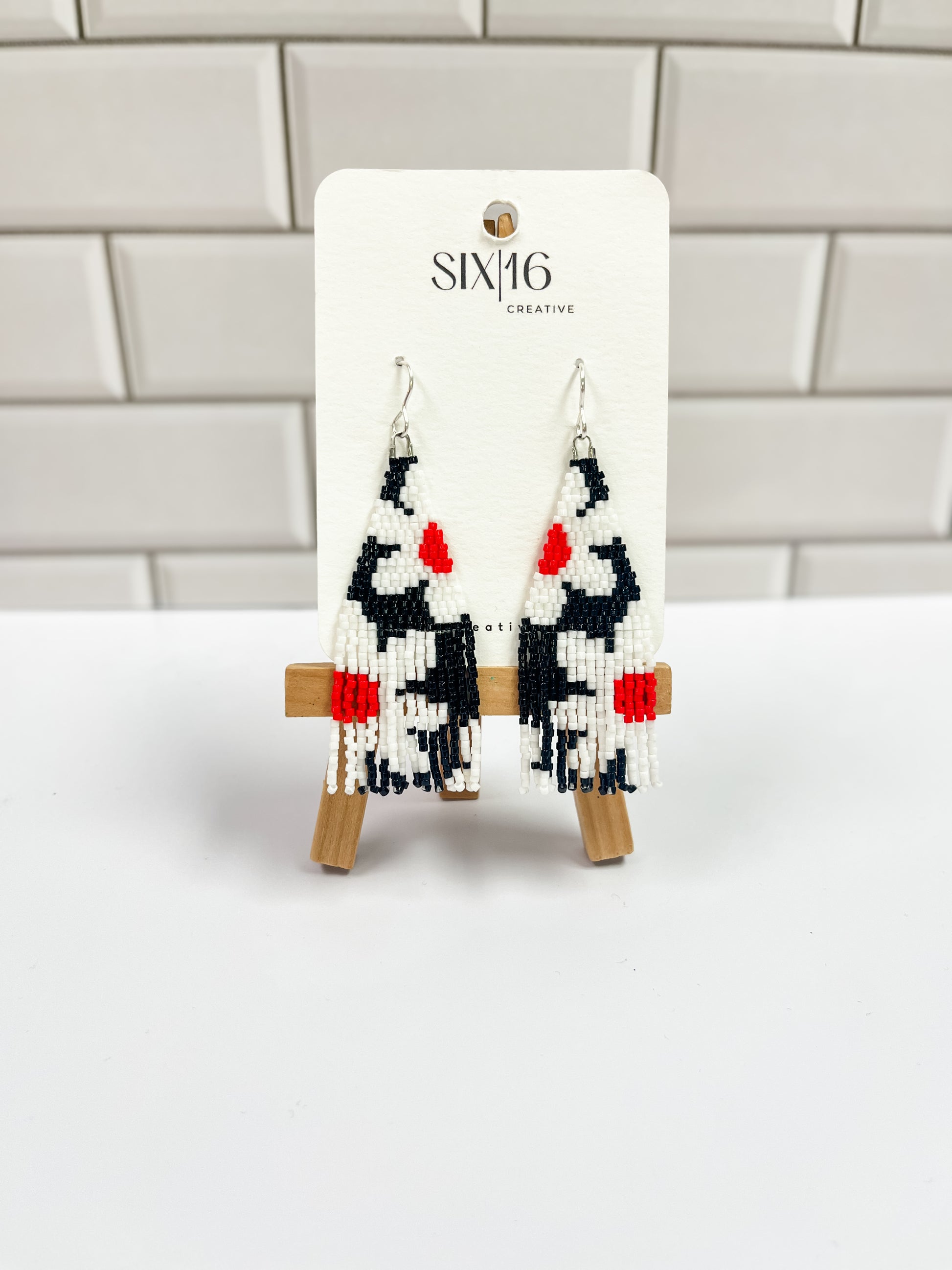 Black beaded earrings with white and red flower fringe on a silver hook. The length is approximately 3 inches.