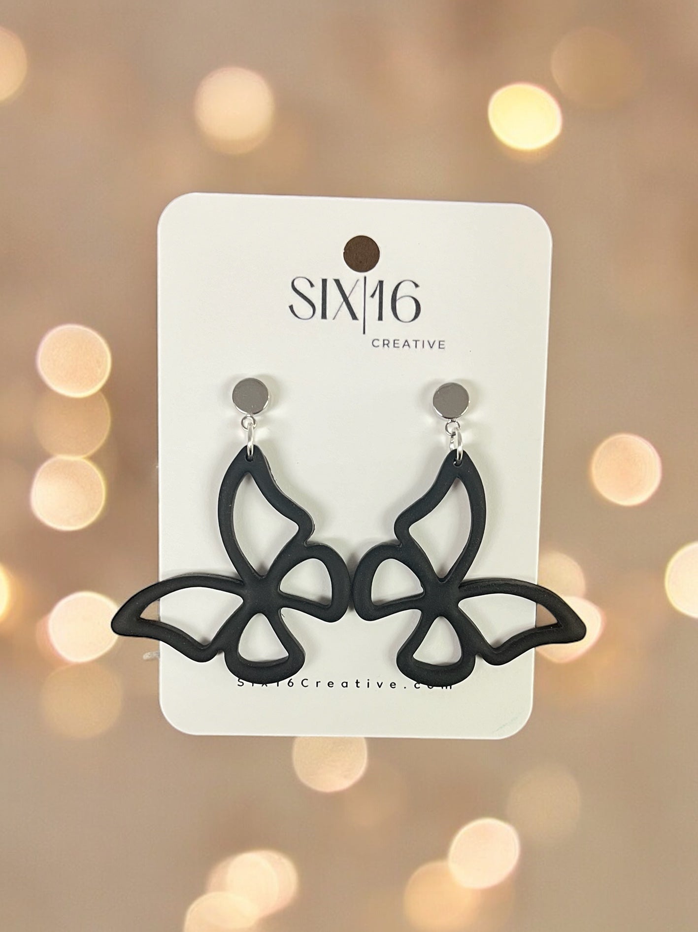 Black butterfly polymer clay earrings on a silver small circle post. Earring length is approximately 2.5 inches.