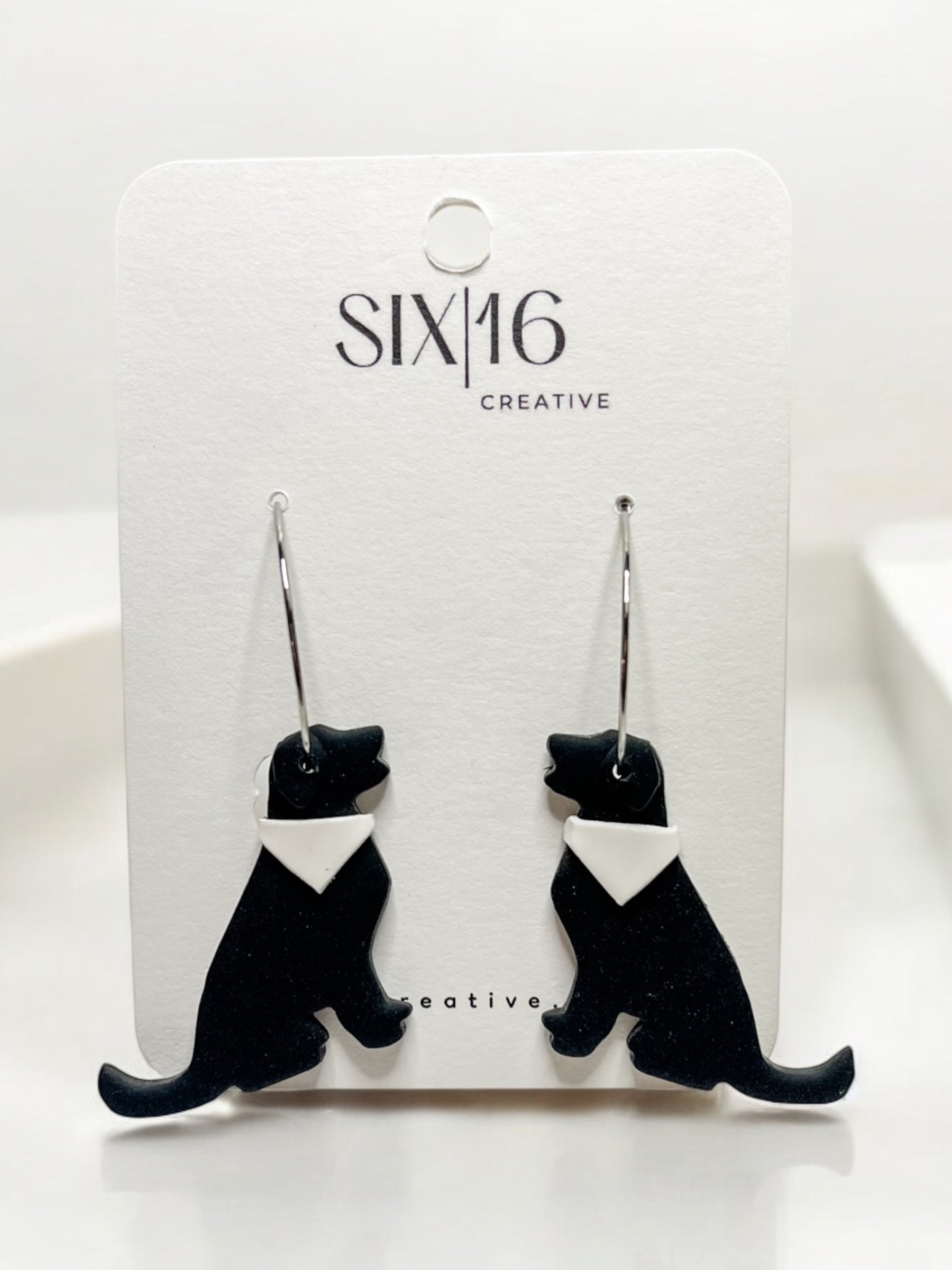 Black dog polymer clay earrings on a stainless steel silver hoop. Earring length is approximately 2.25 inches.