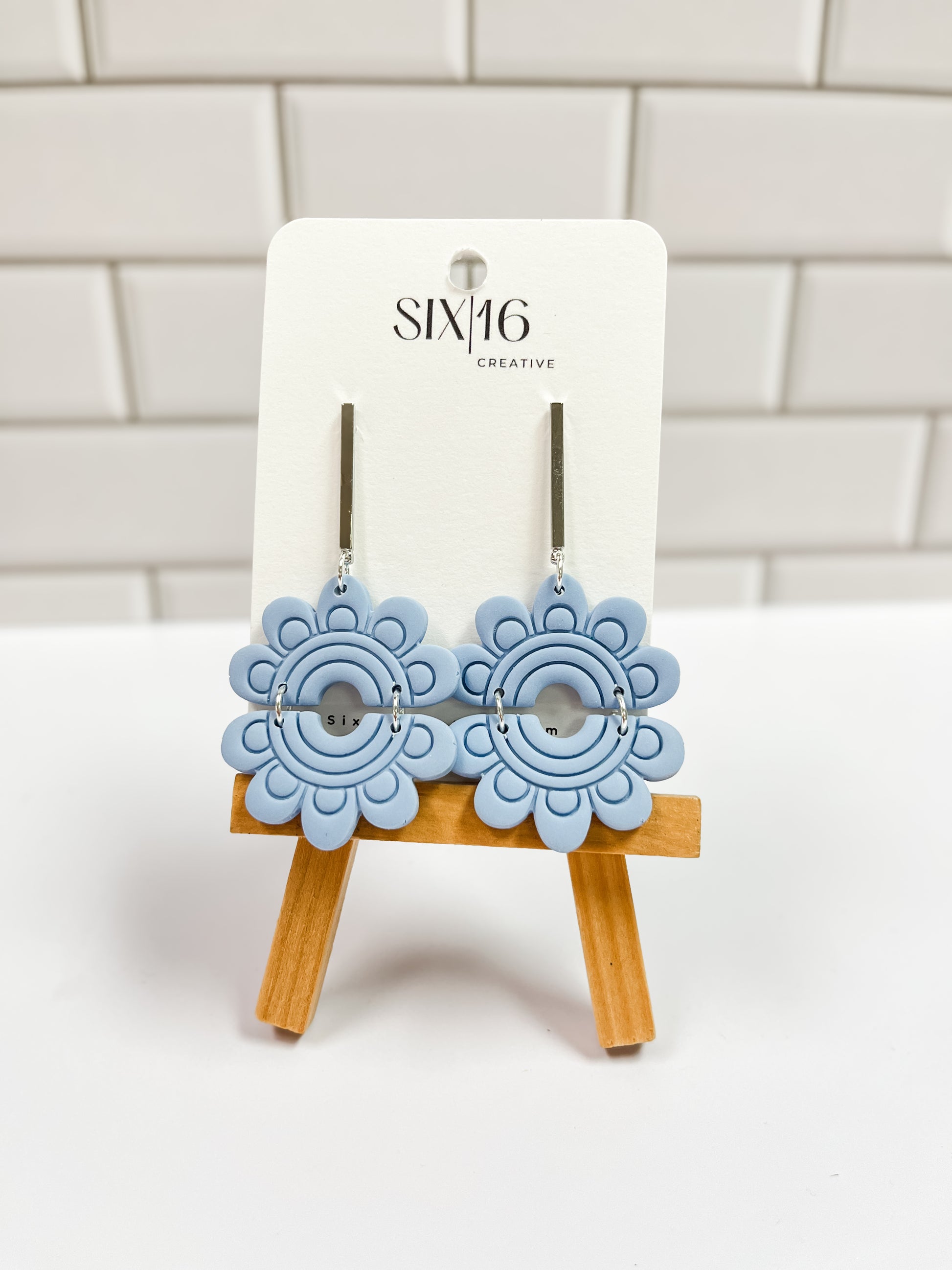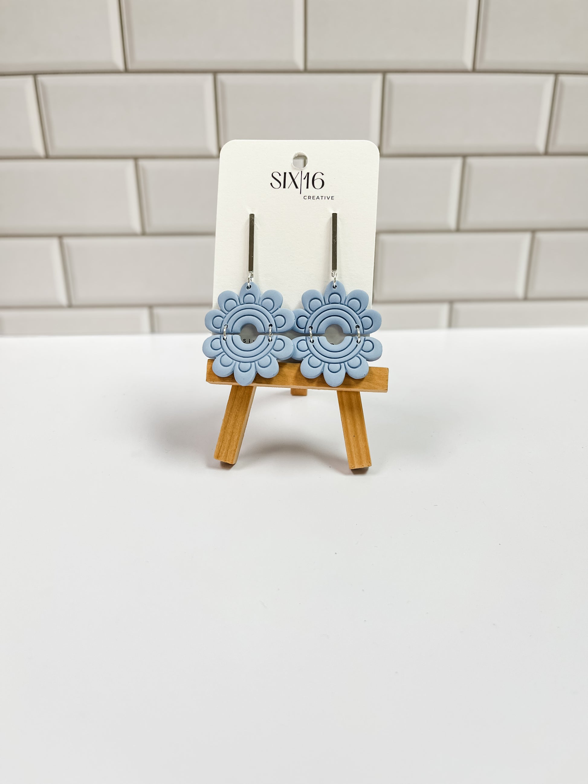 Blue circle polymer clay earrings on a stainless steel long silver bar post. Earring length is approximately 2.5 inches.