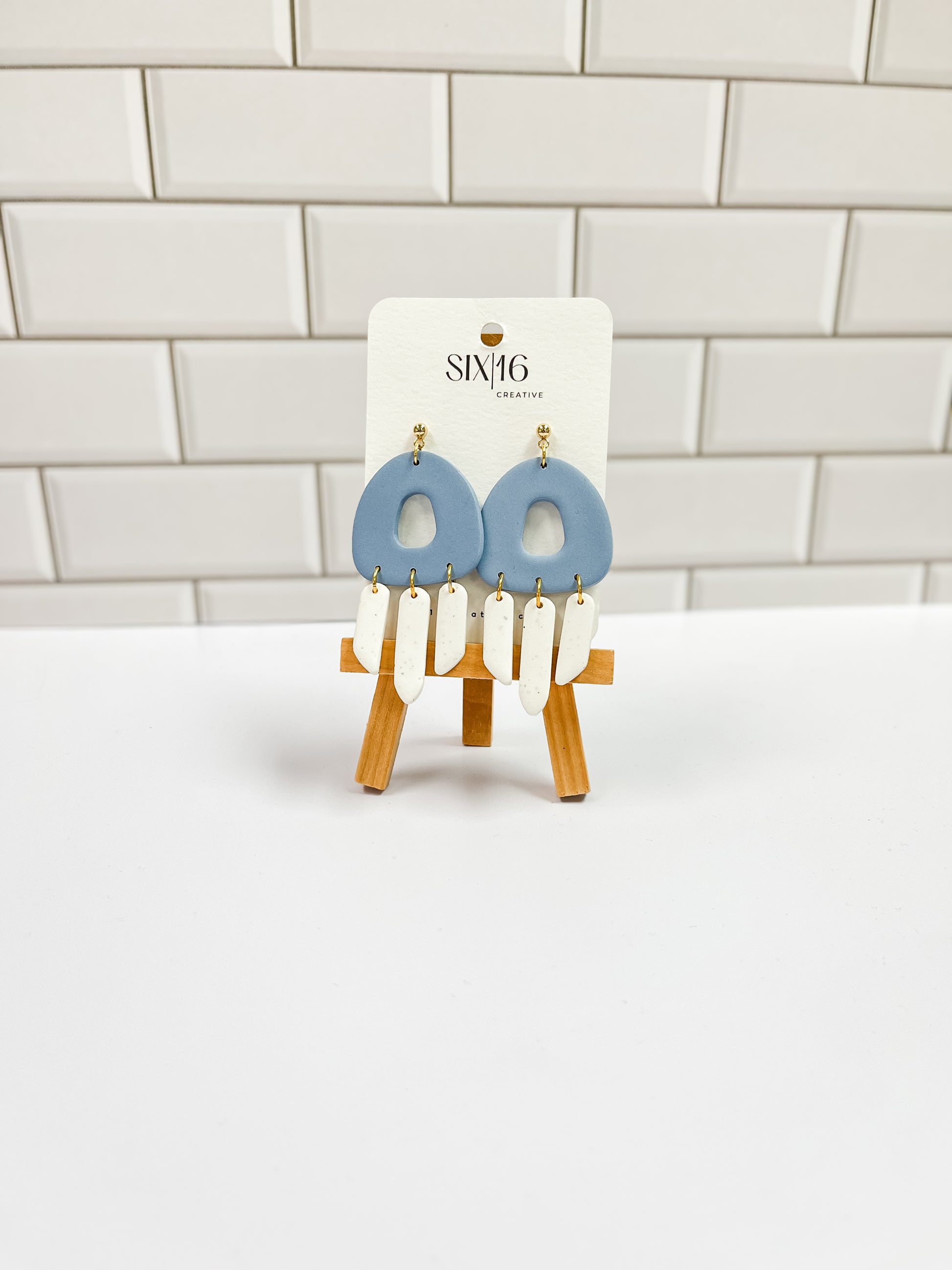 Blue triangle clay earrings with speckled white dangles on a gold stainless steel ball post. Earring length is approximately 3 inches.