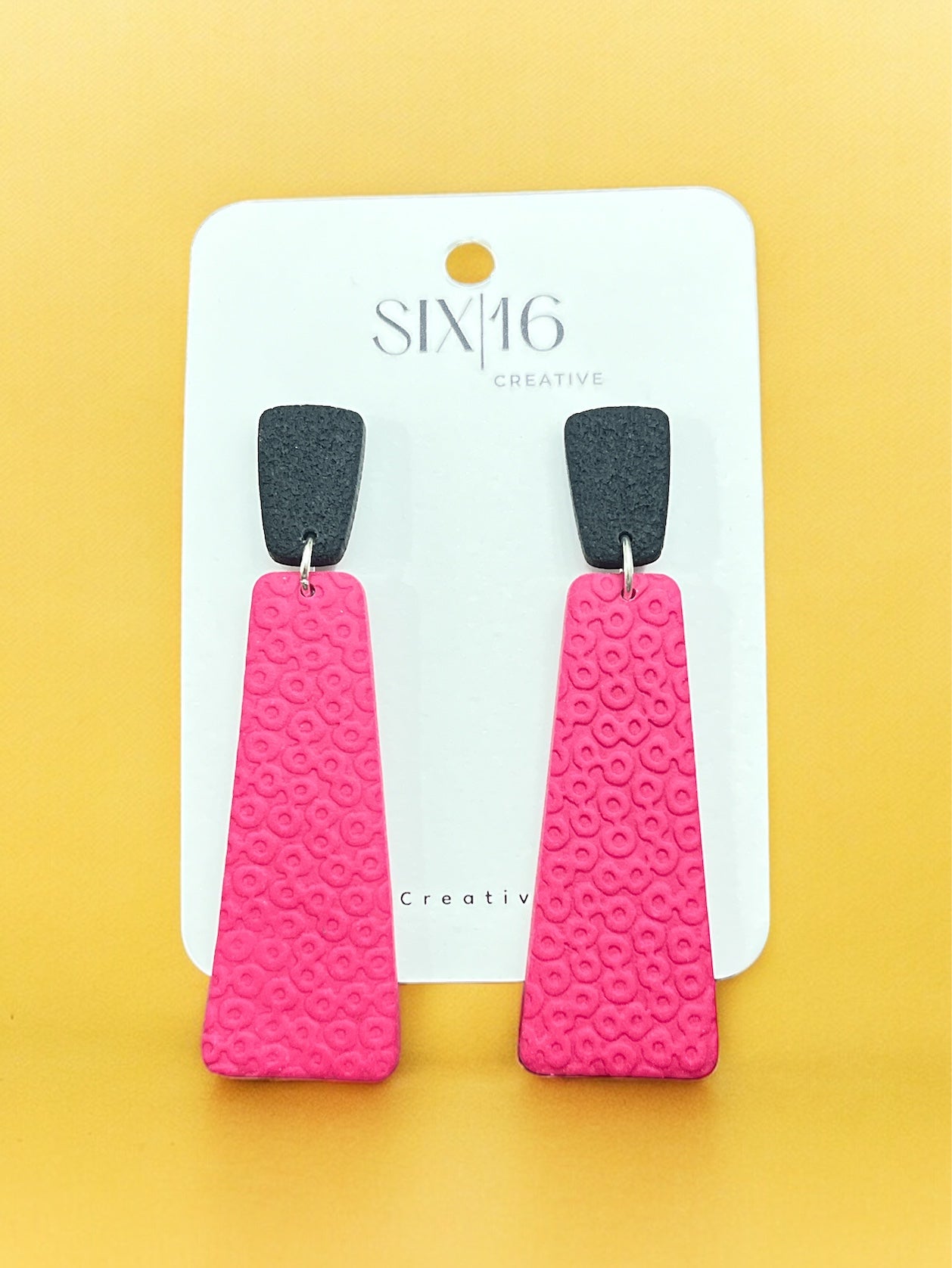 Bright pink rectangle polymer clay earrings on a stainless steel post. Earring length is approximately 2.75 inches.