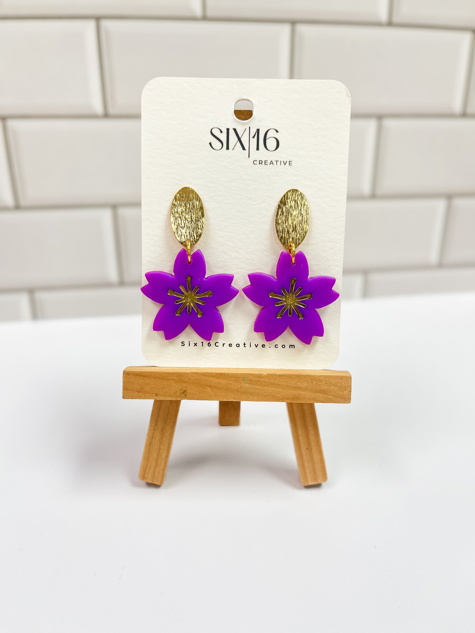 Bright purple flower polymer clay earrings with a gold center on a gold oval stud. Earring length is approximately 1.75 inches.