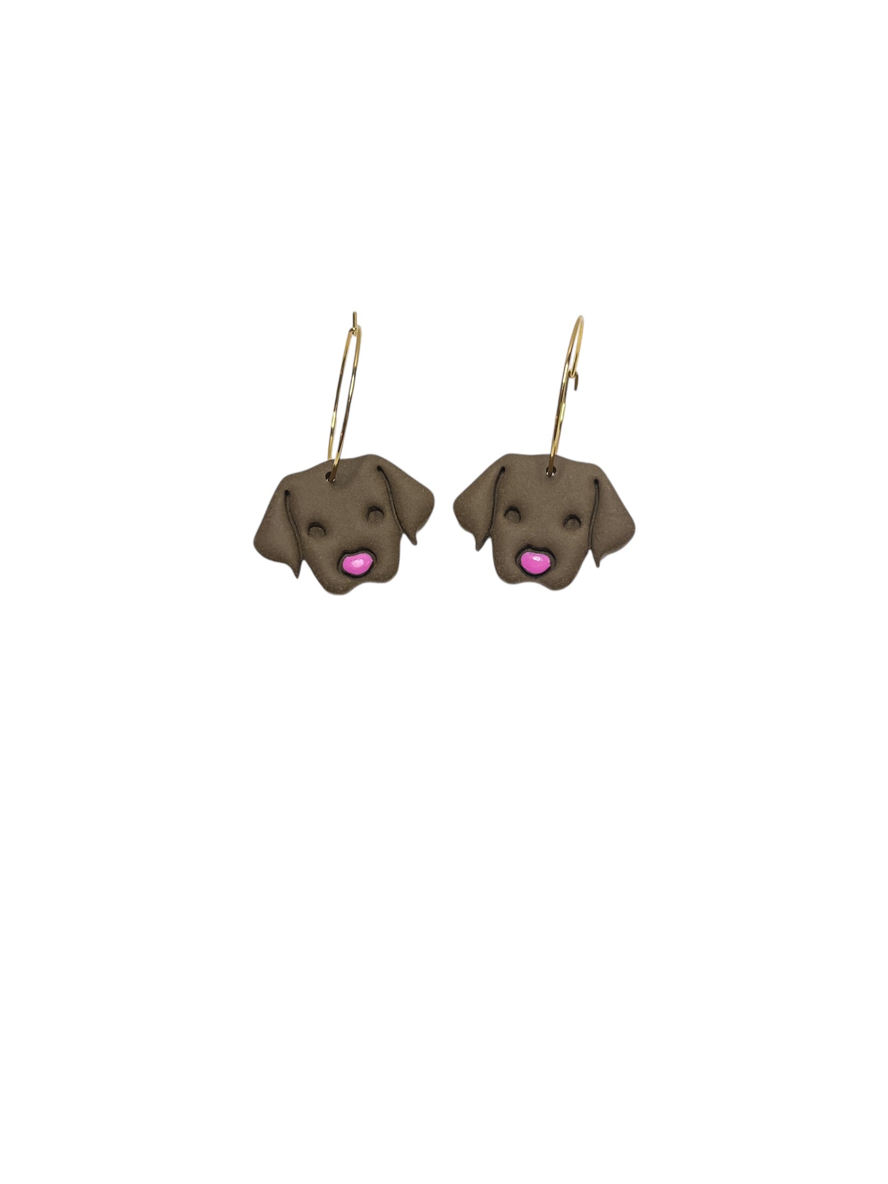 Brown dog face polymer clay earrings on stainless steel gold hoop. Earring length is approximately 1.5 inches.