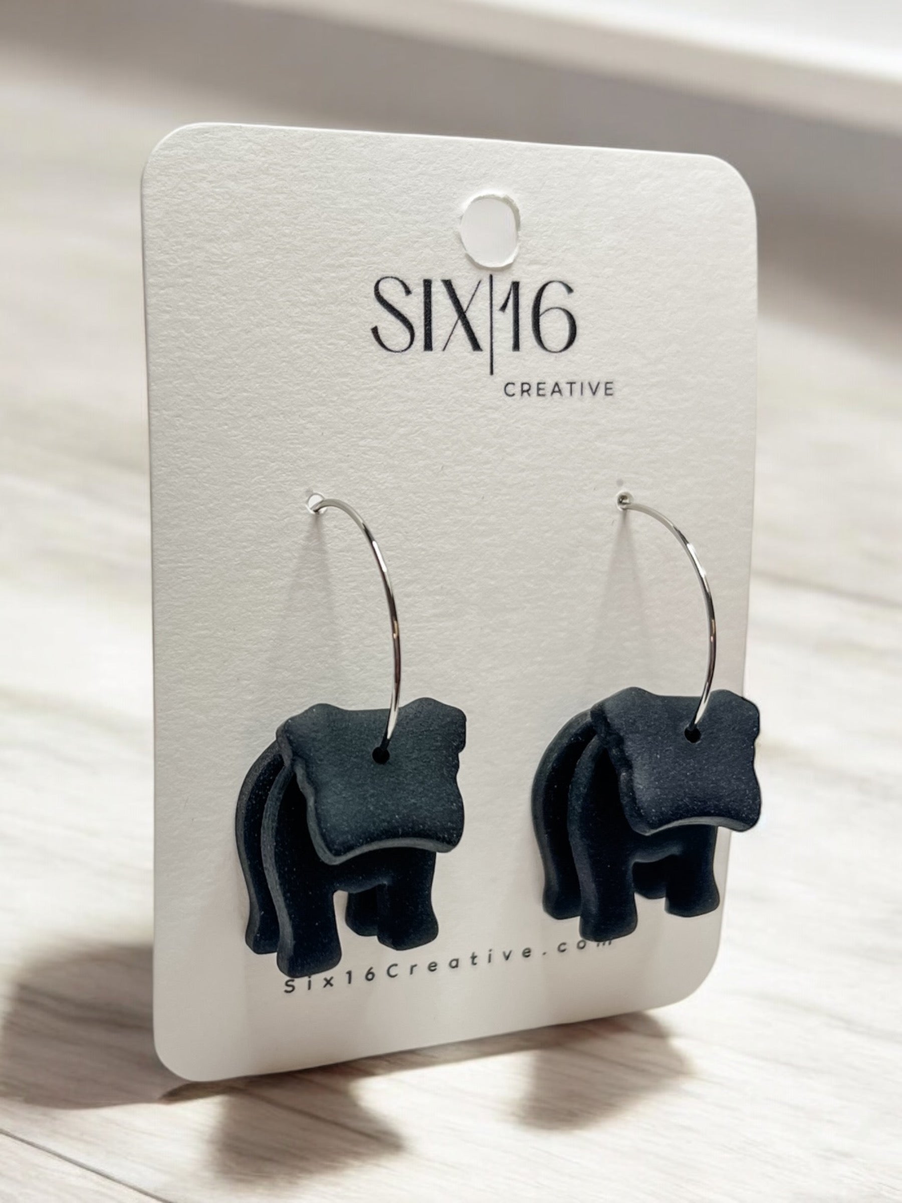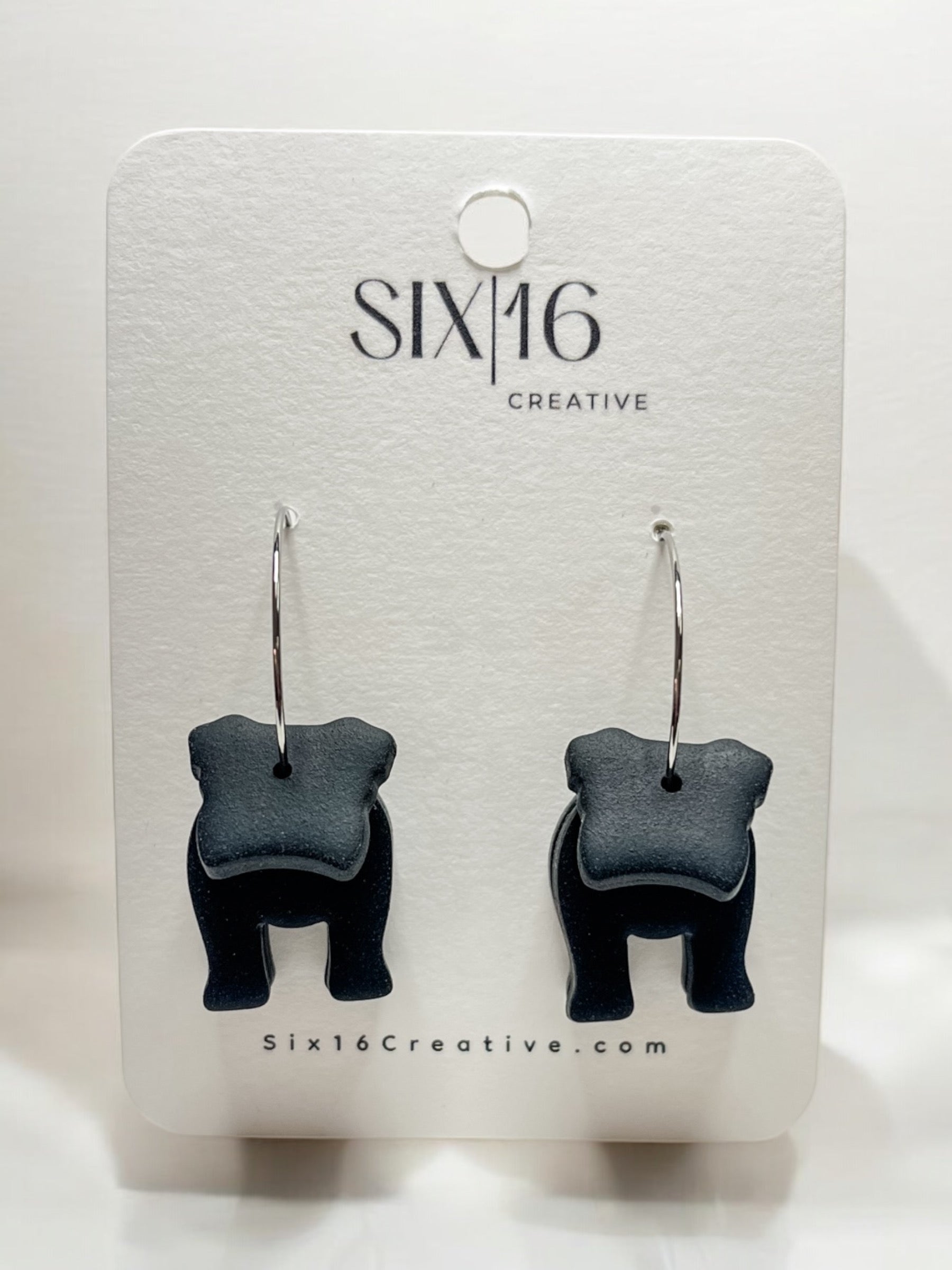Black bulldog polymer clay earrings on a stainless steel silver hoop. Earring length is approximately 1.5 inches.