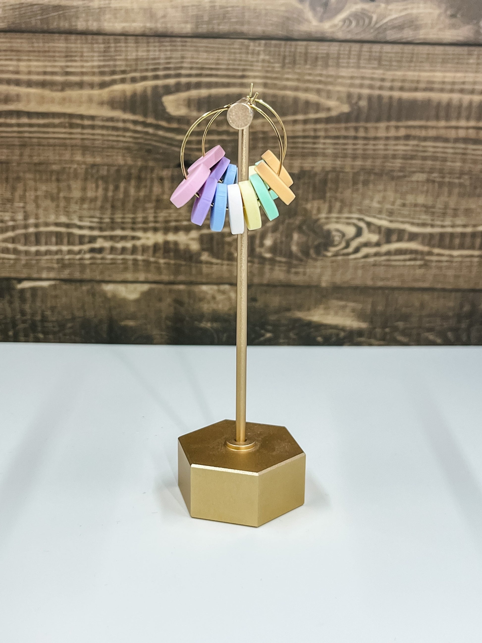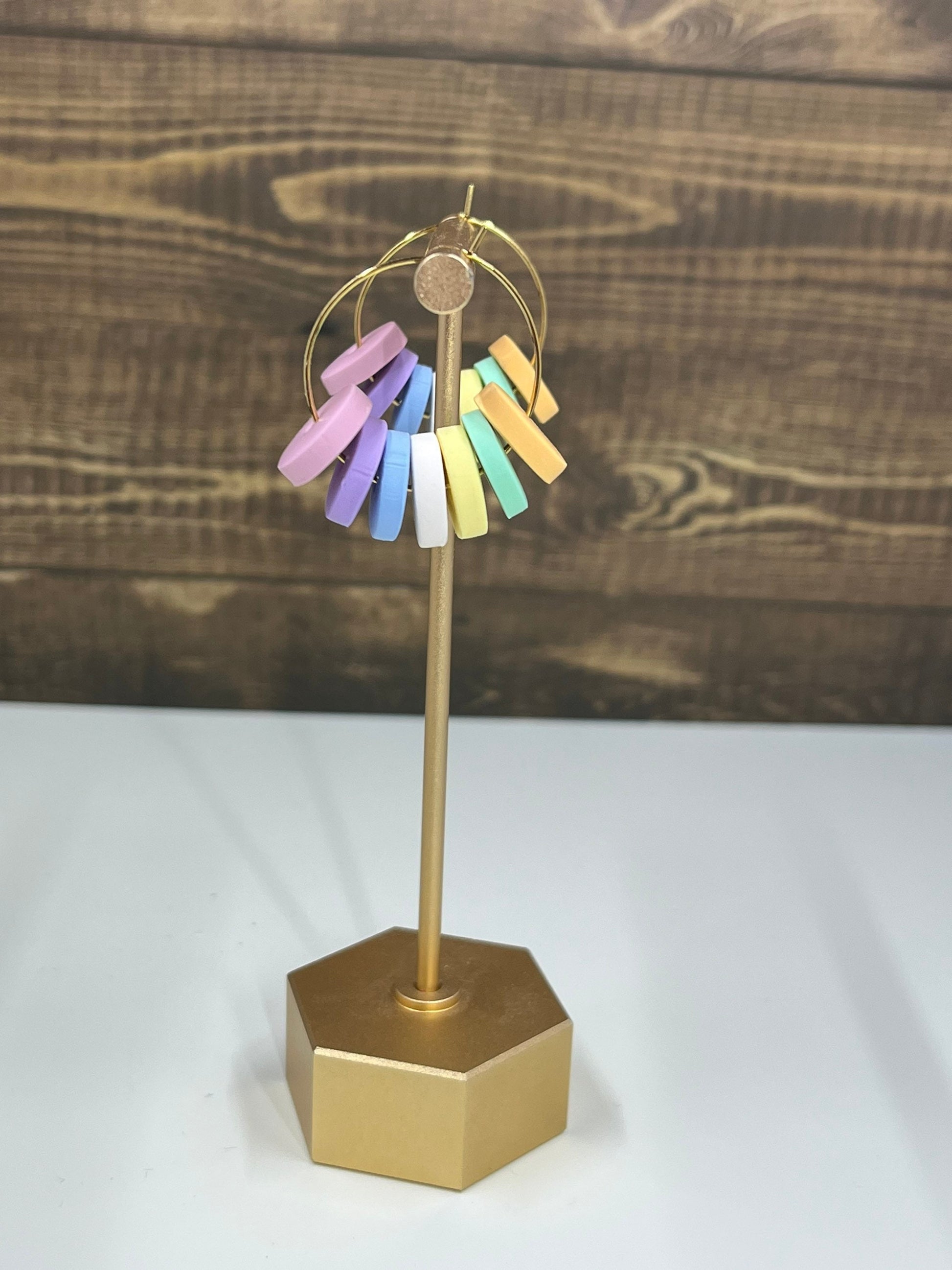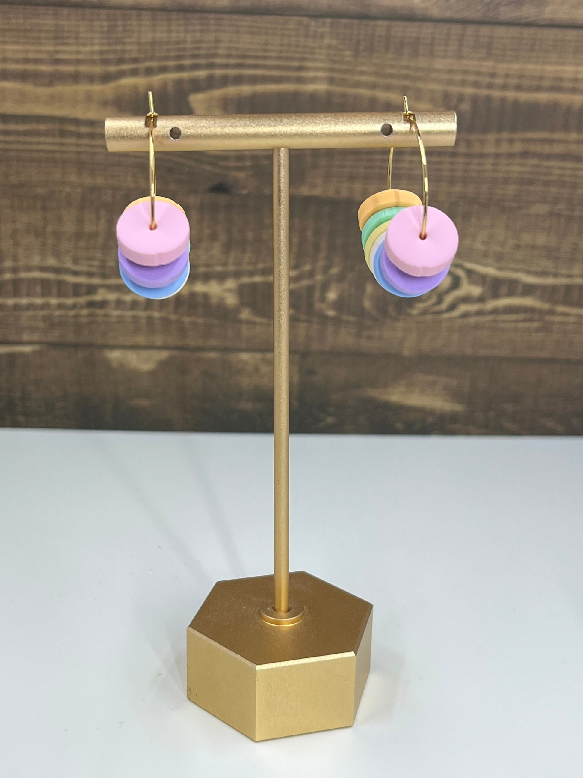 Clay discs that look like candy on a stainless steel gold hoop. Earring length is approximately 1.5 inches.