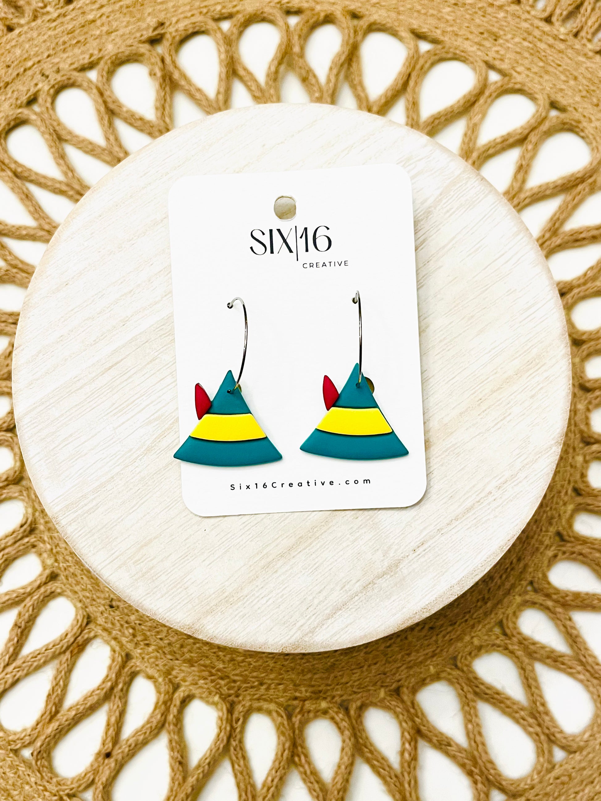 Christmas elf hat polymer clay earrings on a silver stainless steel hoop. Earring length is approximately 2 inches.