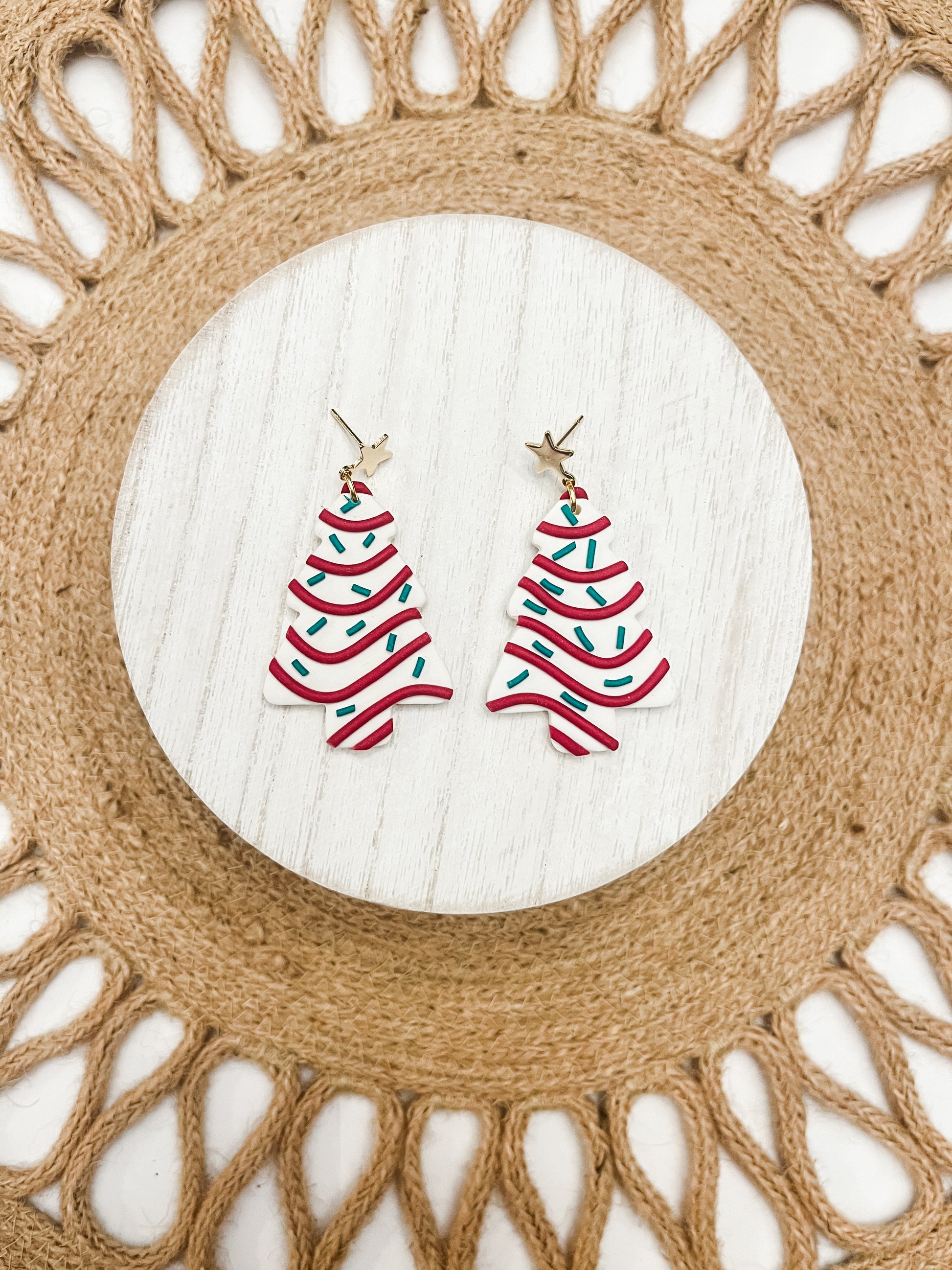Christmas tree cake polymer clay earrings on a gold star post. Earring length is approximately 1.75 inches.