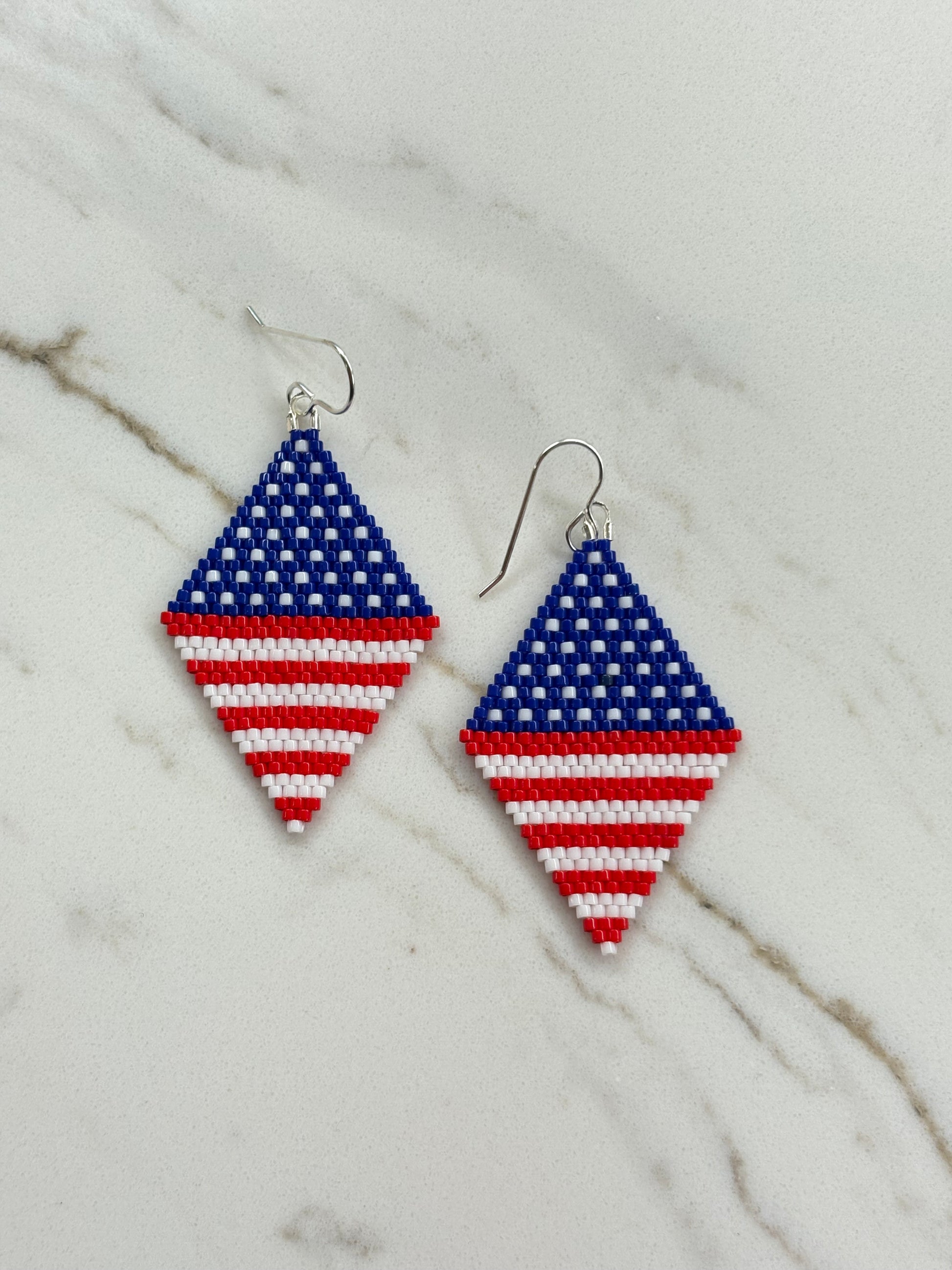 Red, white and blue American flag beaded diamond earrings on a stainless steel silver hook. The length is approximately 2.5 inches.