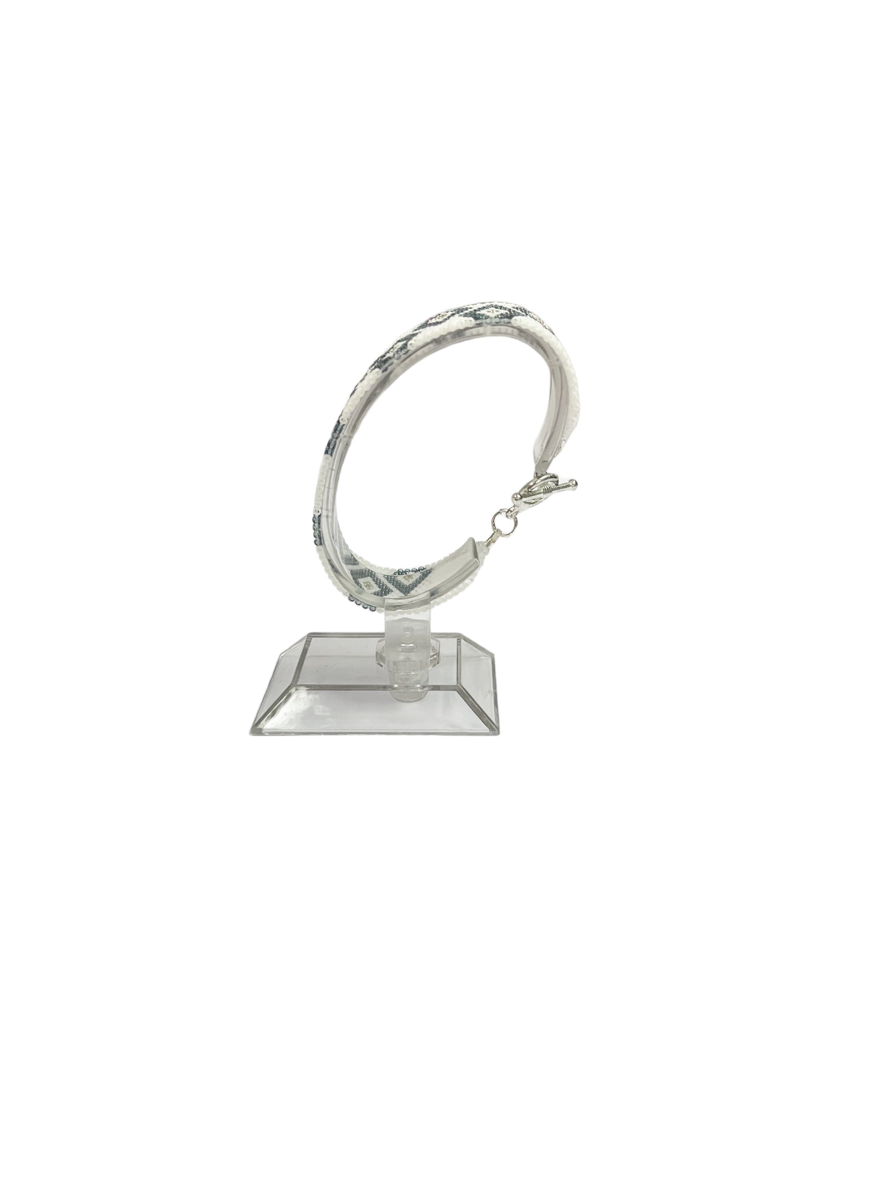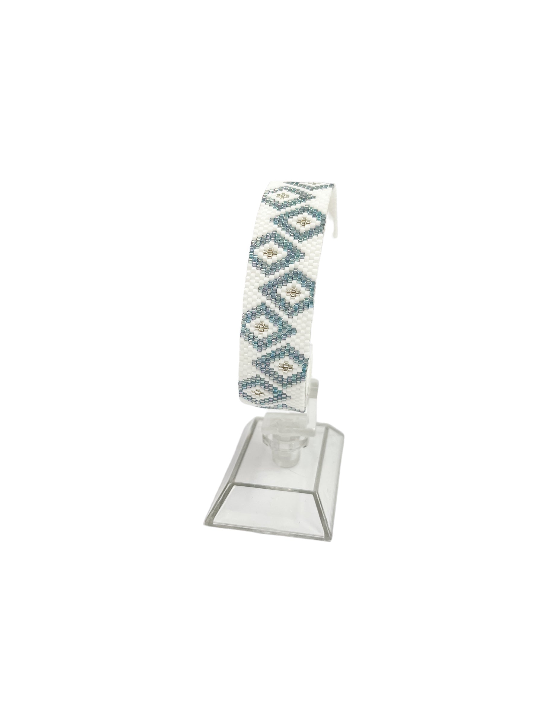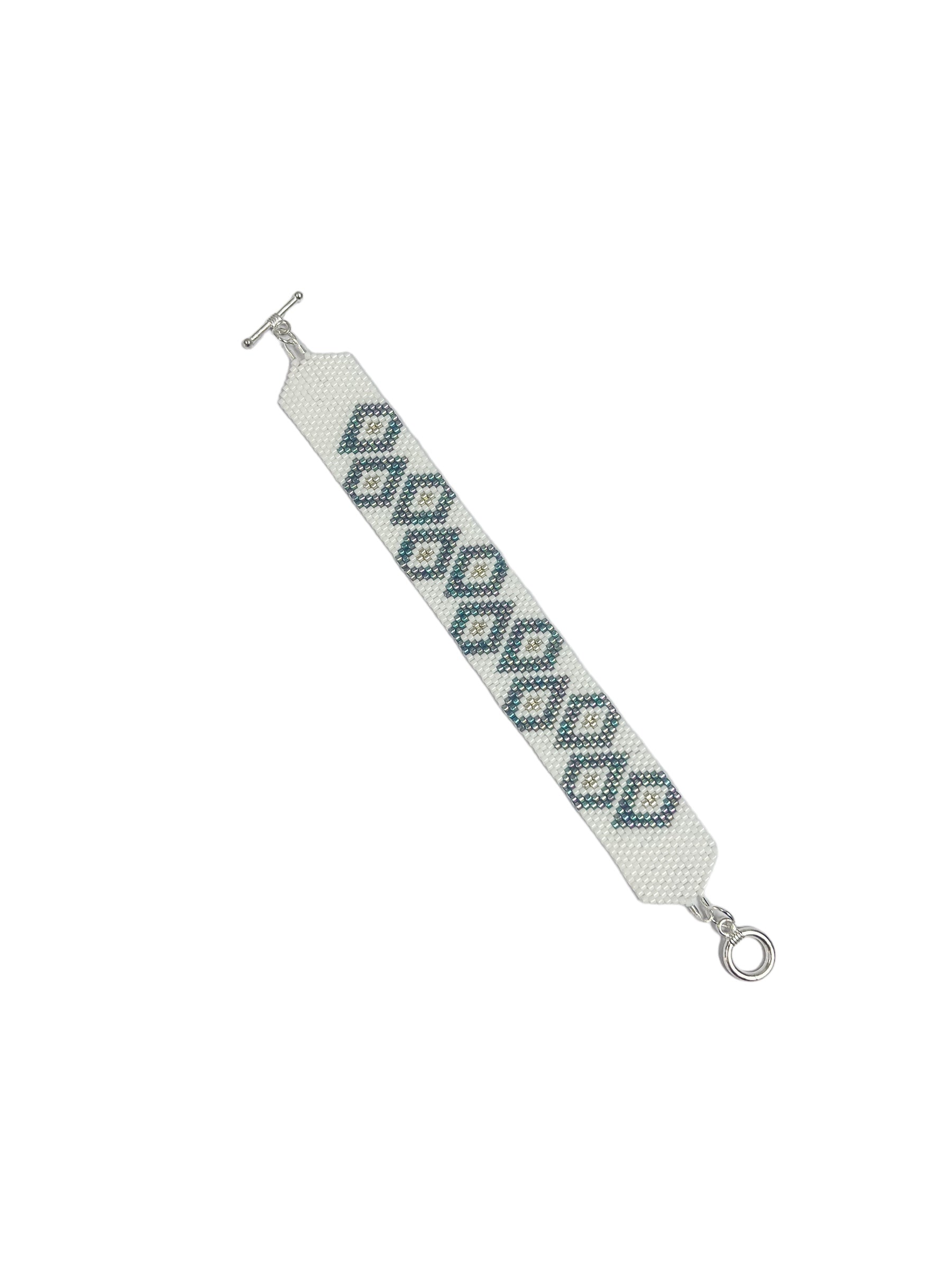 Gray and white diamond pattern beaded bracelet with an easy bar and circle clasp. Bracelet length is approximately 7 inches. Please add a note to your order if you need the bracelet extended.