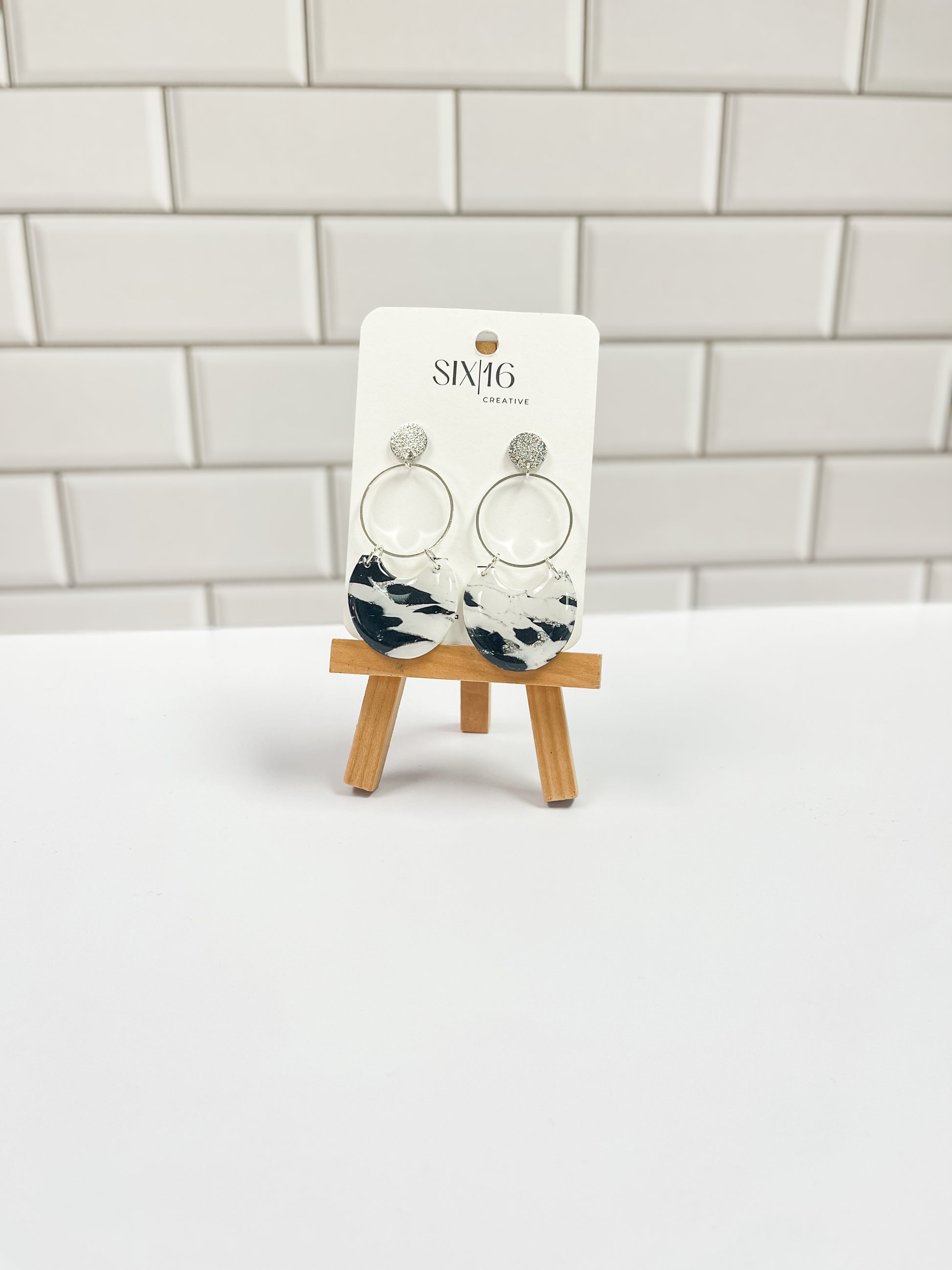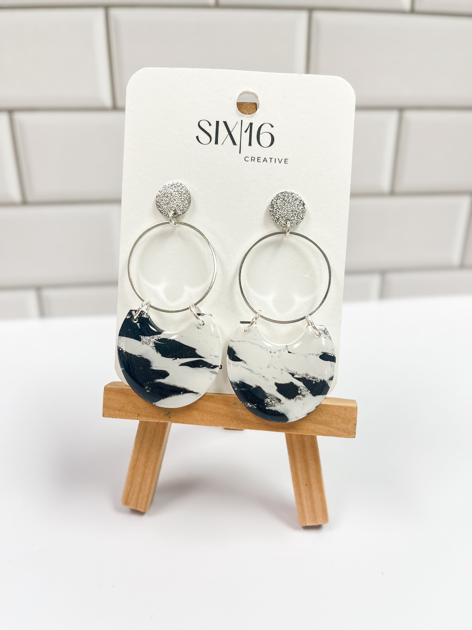 Black and white marble polymer clay earrings on a silver textured circle. Earring length is approximately 2.5 inches.