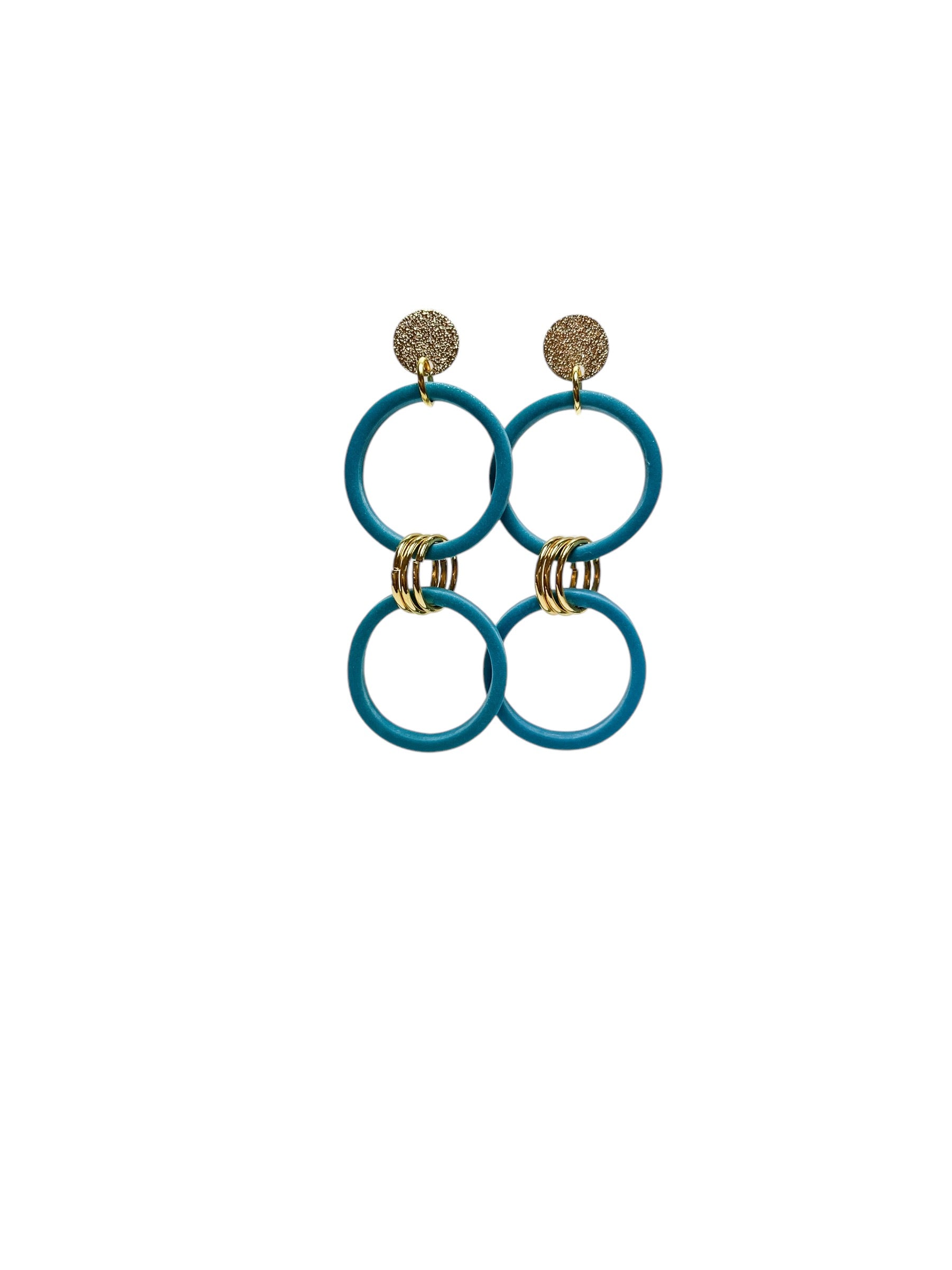 Sea foam double circle polymer clay earrings on a stainless steel gold circle post. Earring length is approximately 2.5 inches.