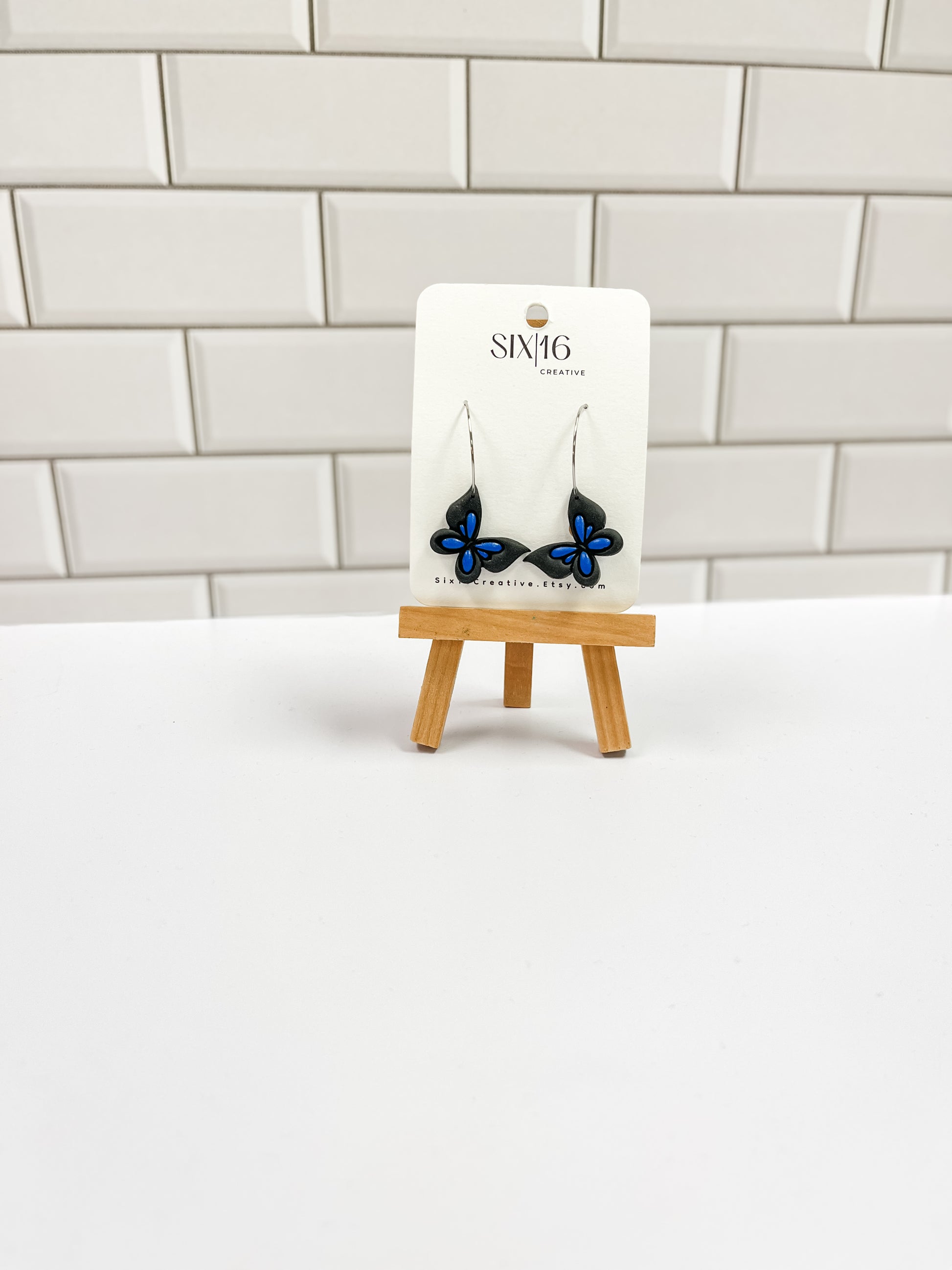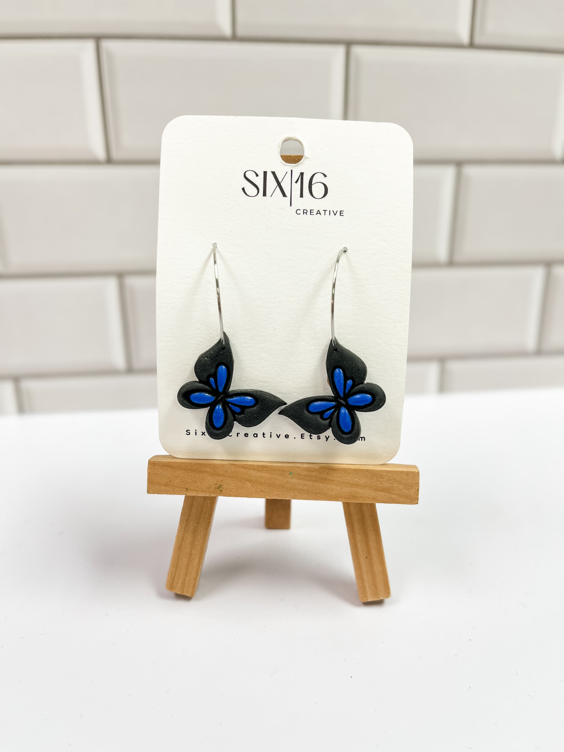 Black and blue butterfly polymer clay earrings on a stainless steel silver hoop. Earring length is approximately 2 inches.