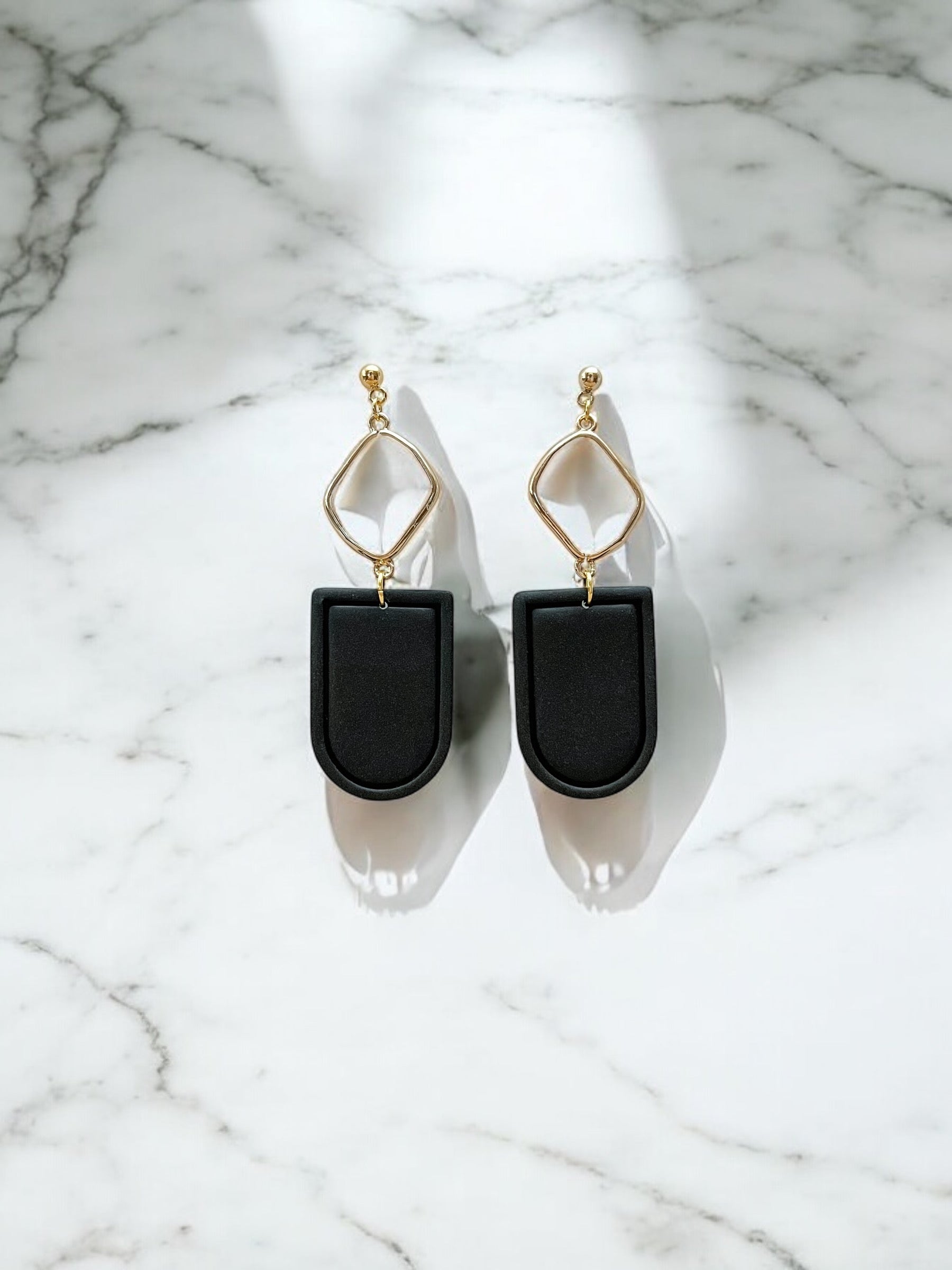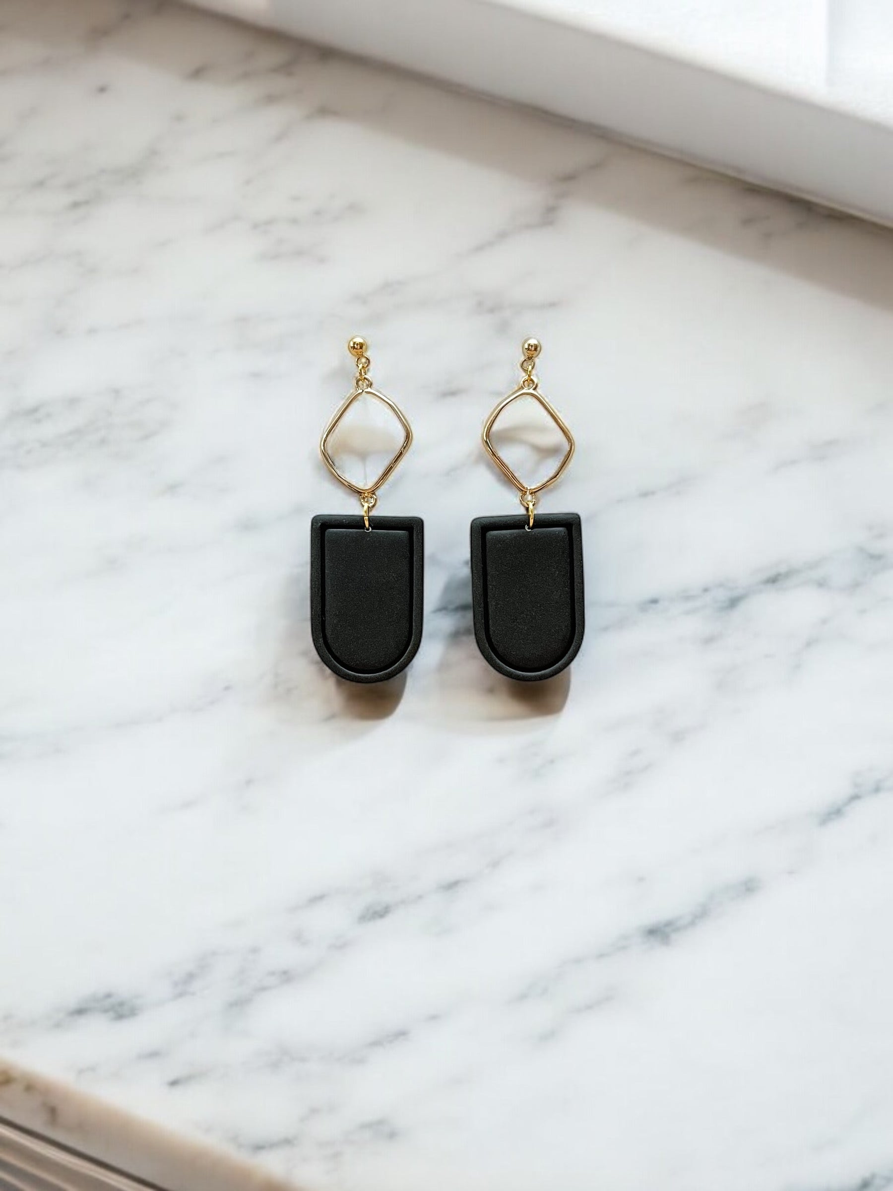Black arch clay earrings with a clear glass charm on a gold stainless steel ball post. Earring length is approximately 2.5 inches.