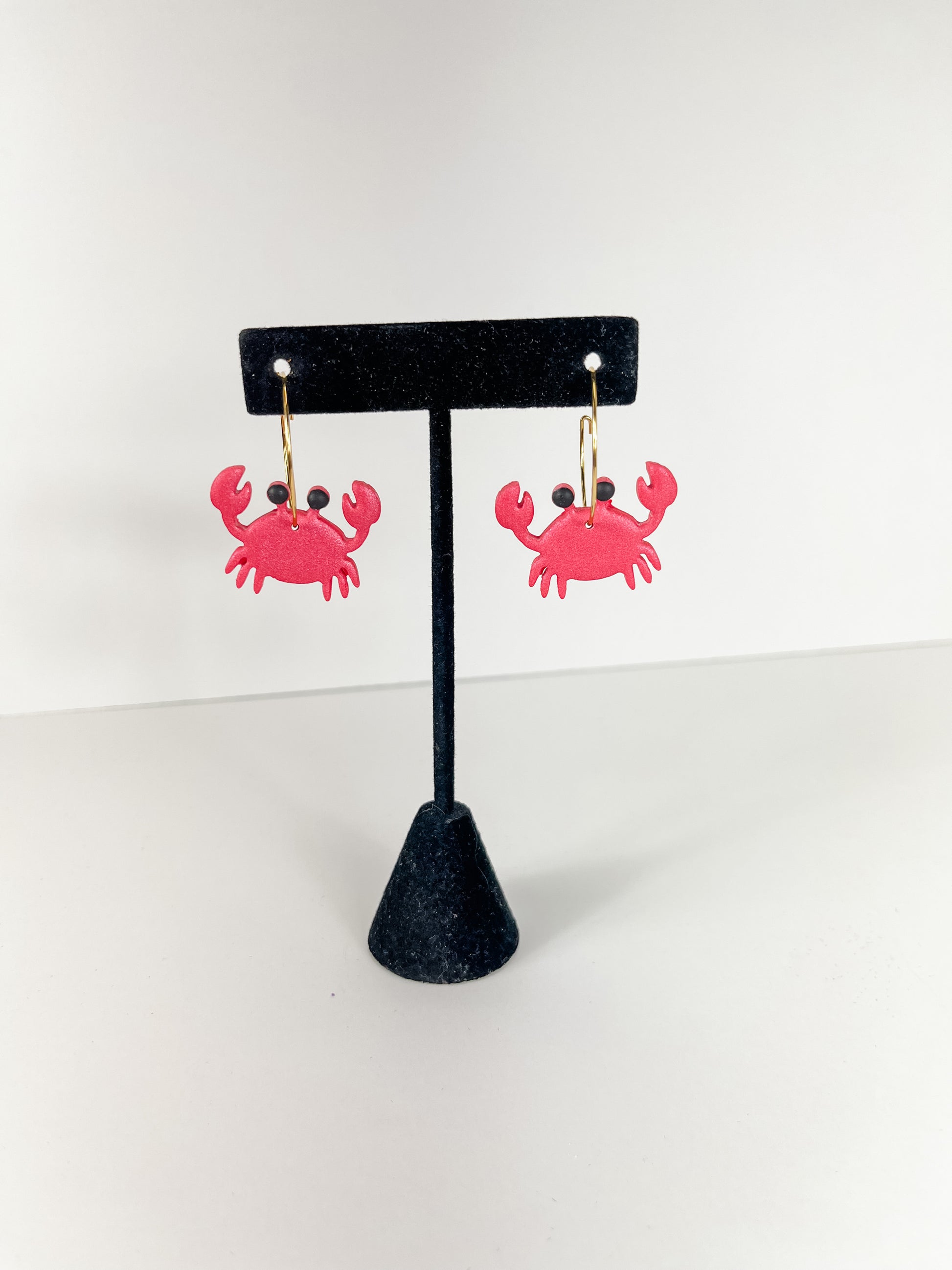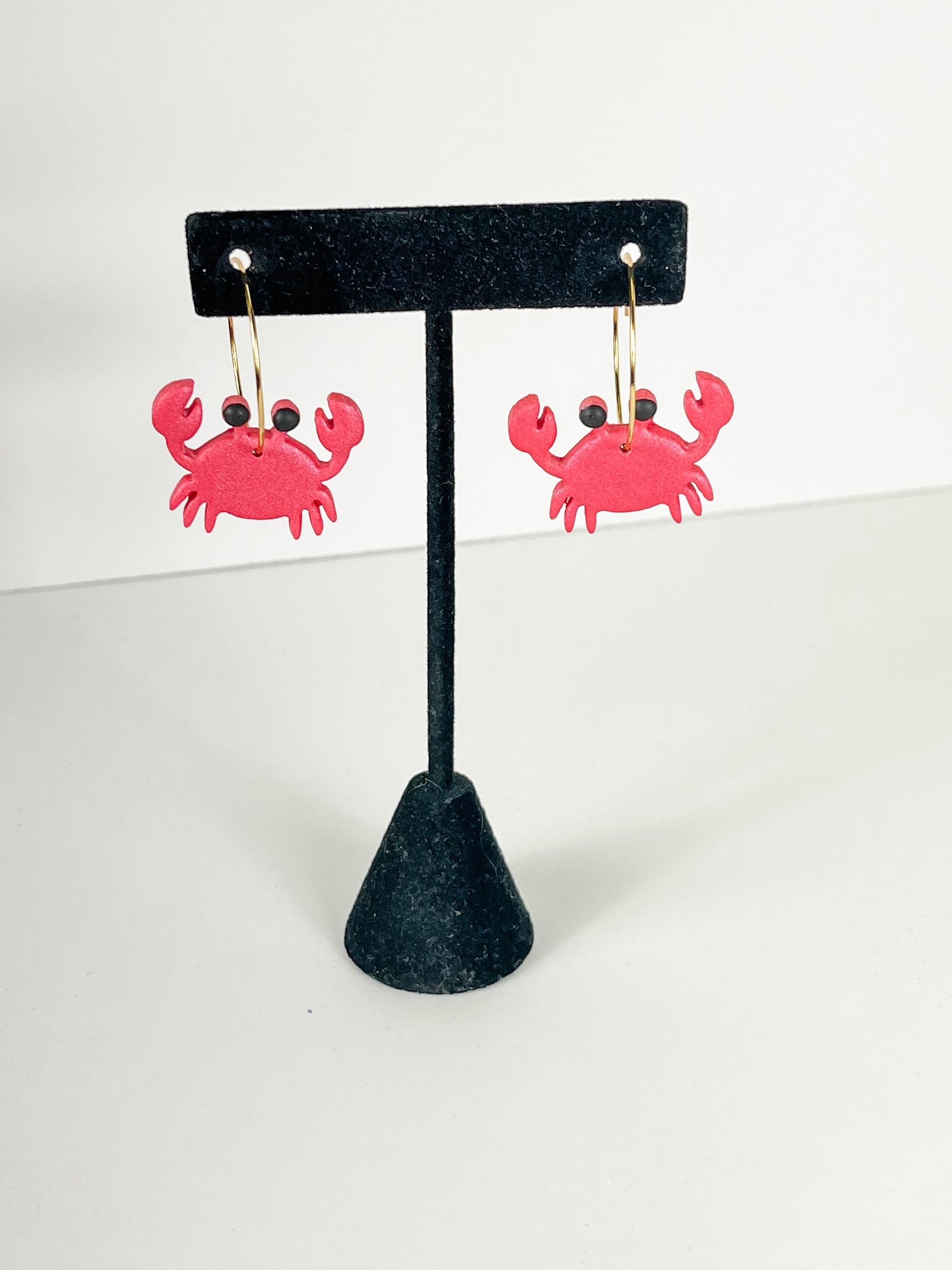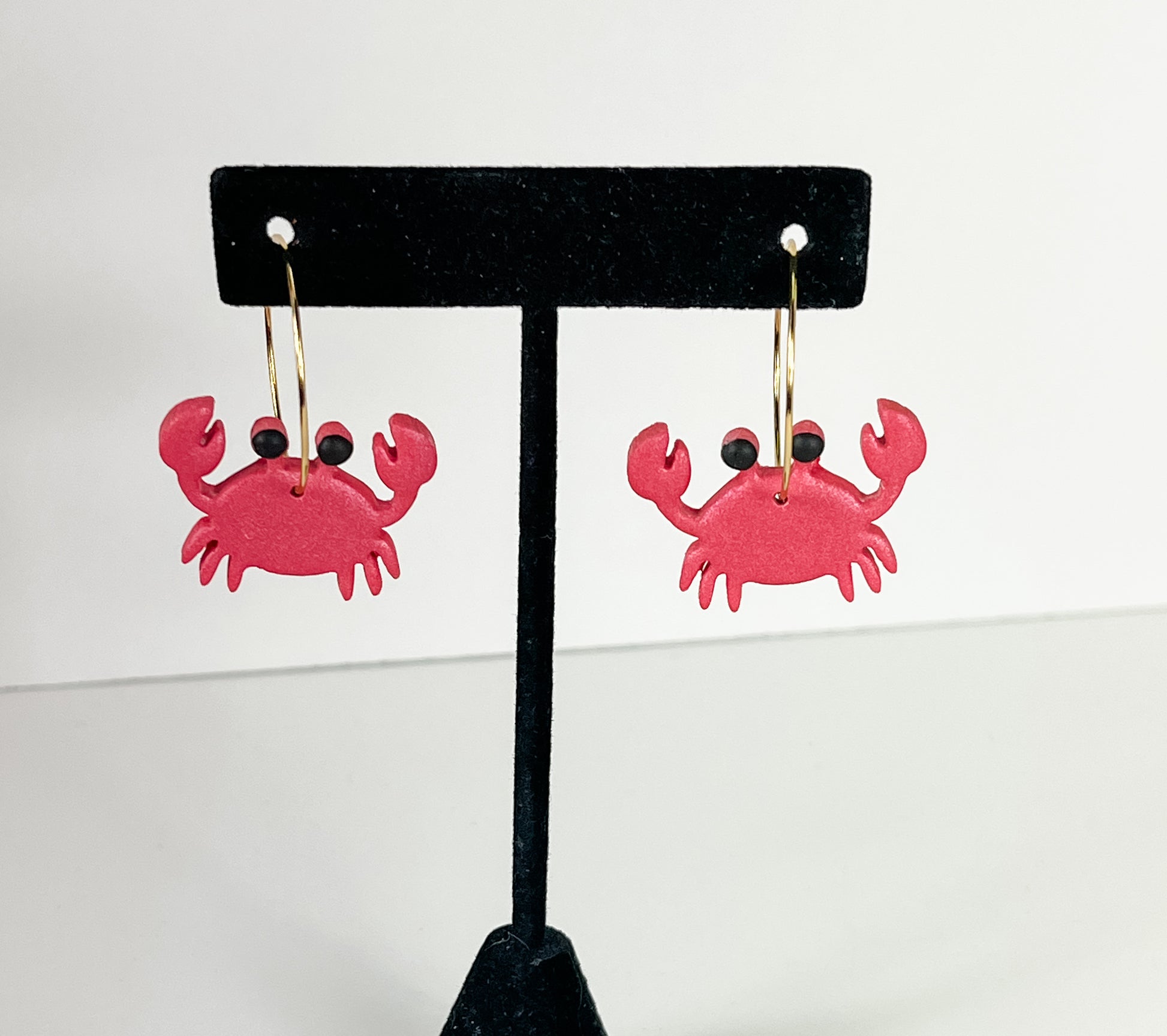 Sparkling red crab polymer clay earrings on a gold stainless steel hoop. Earring length is approximately 1.25 inches.