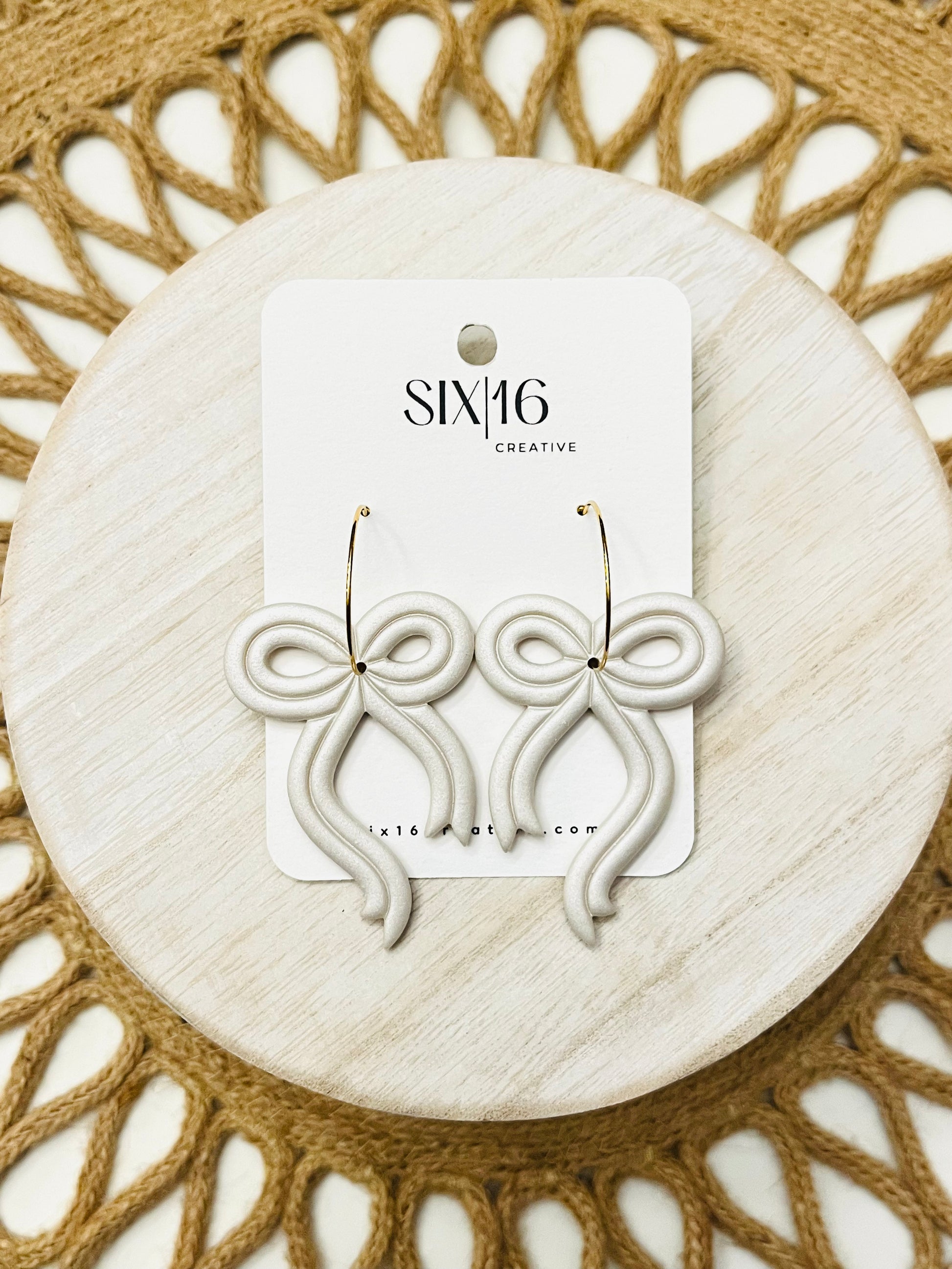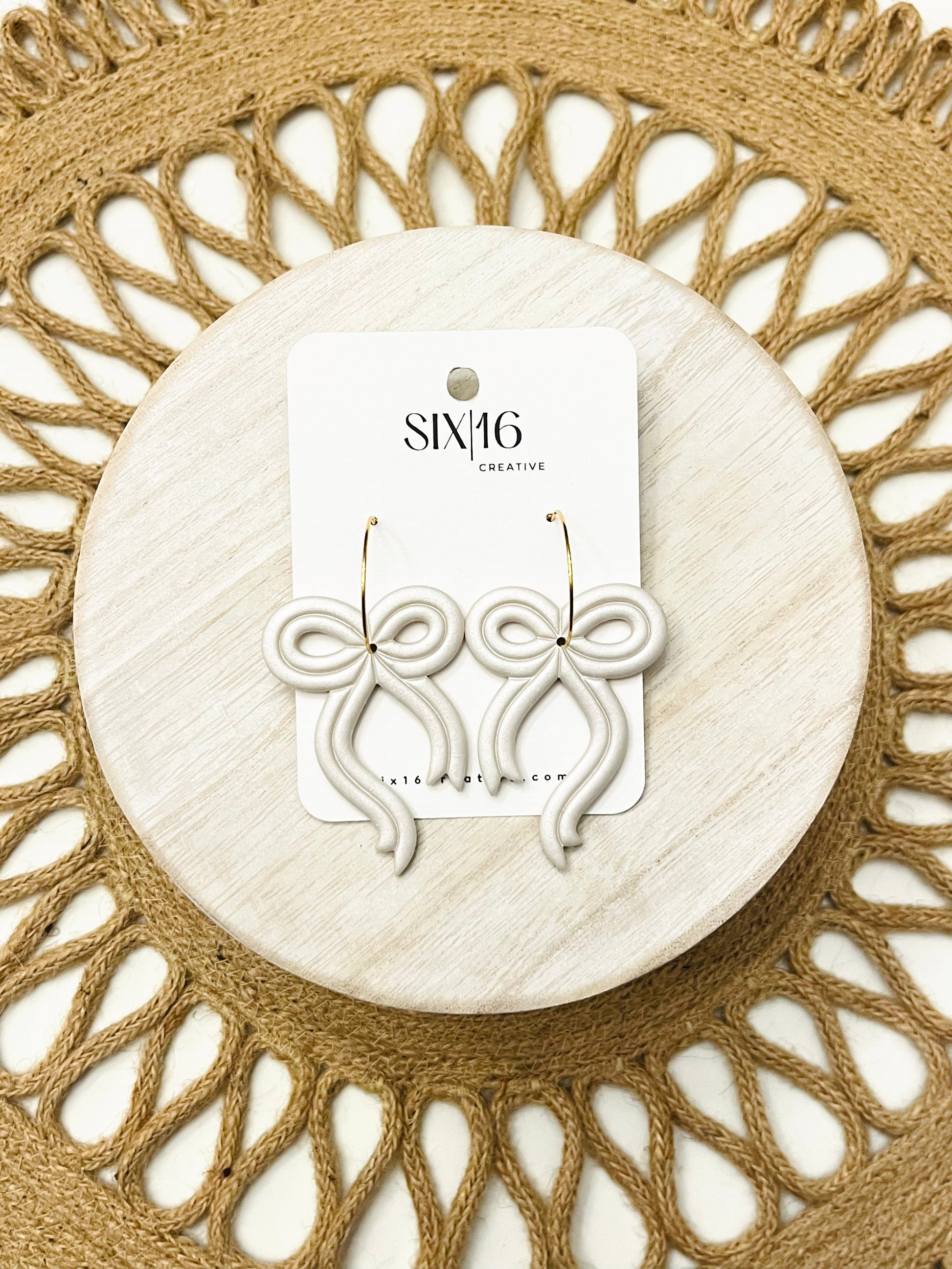 Pearl shimmer bow polymer clay earrings on a stainless steel gold hoop. Earring length is approximately 2.5 inches.