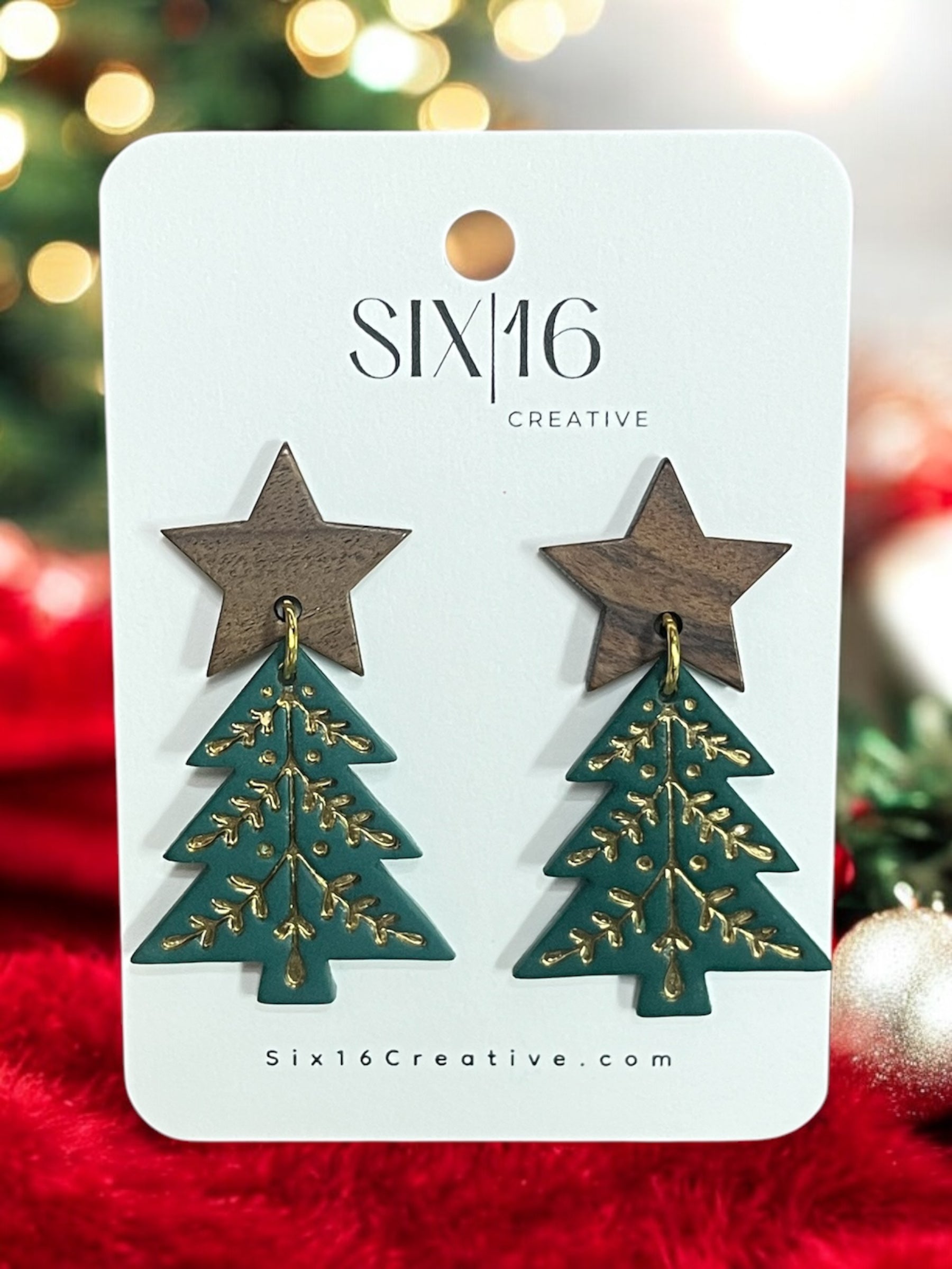 Green Christmas tree with gold detail polymer clay earrings on a wooden top with stainless steel post. Earring length is approximately 2 inches.