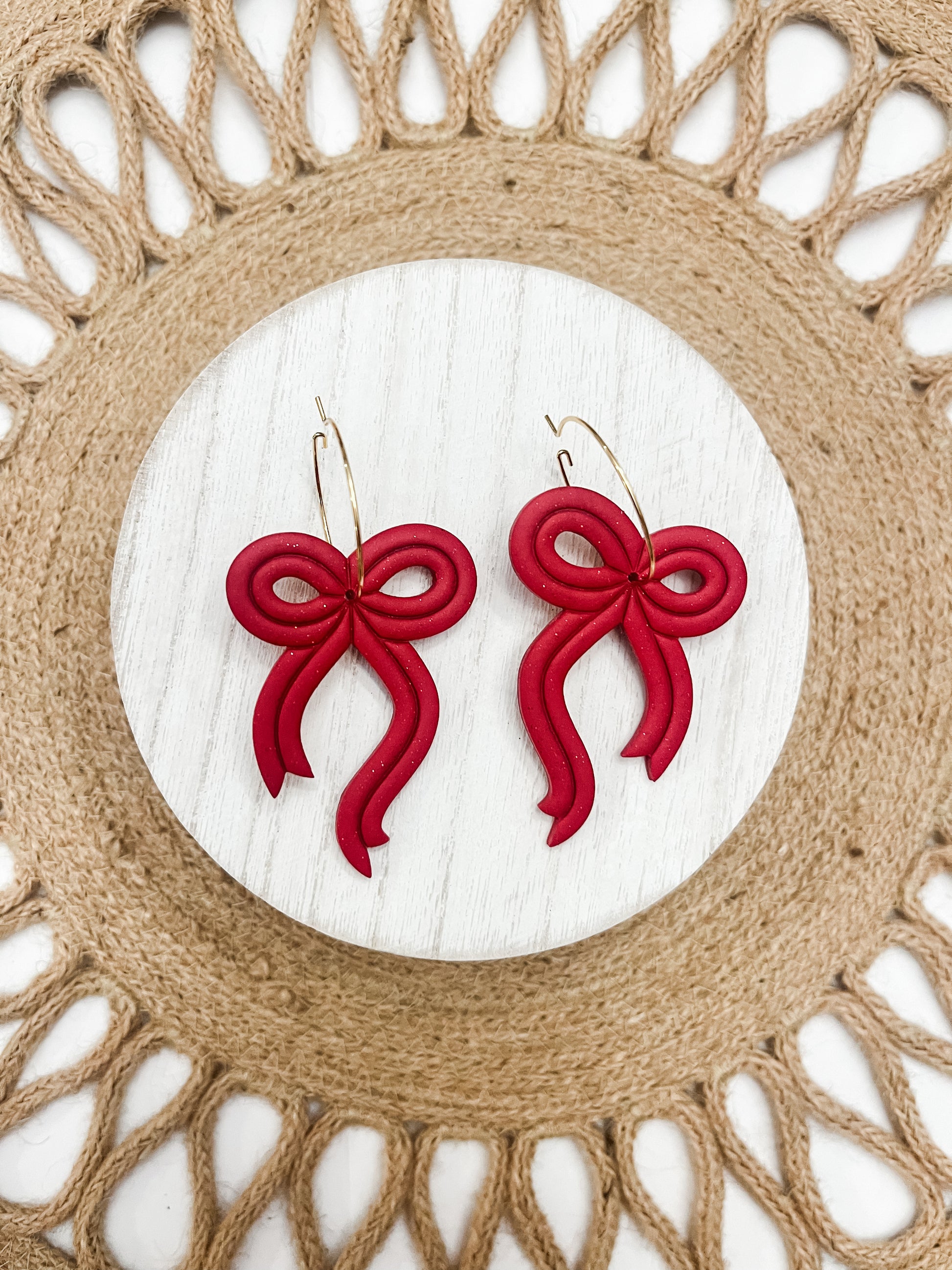 Glitter red bow polymer clay earrings on a stainless steel gold hoop. Earring length is approximately 2.5 inches.