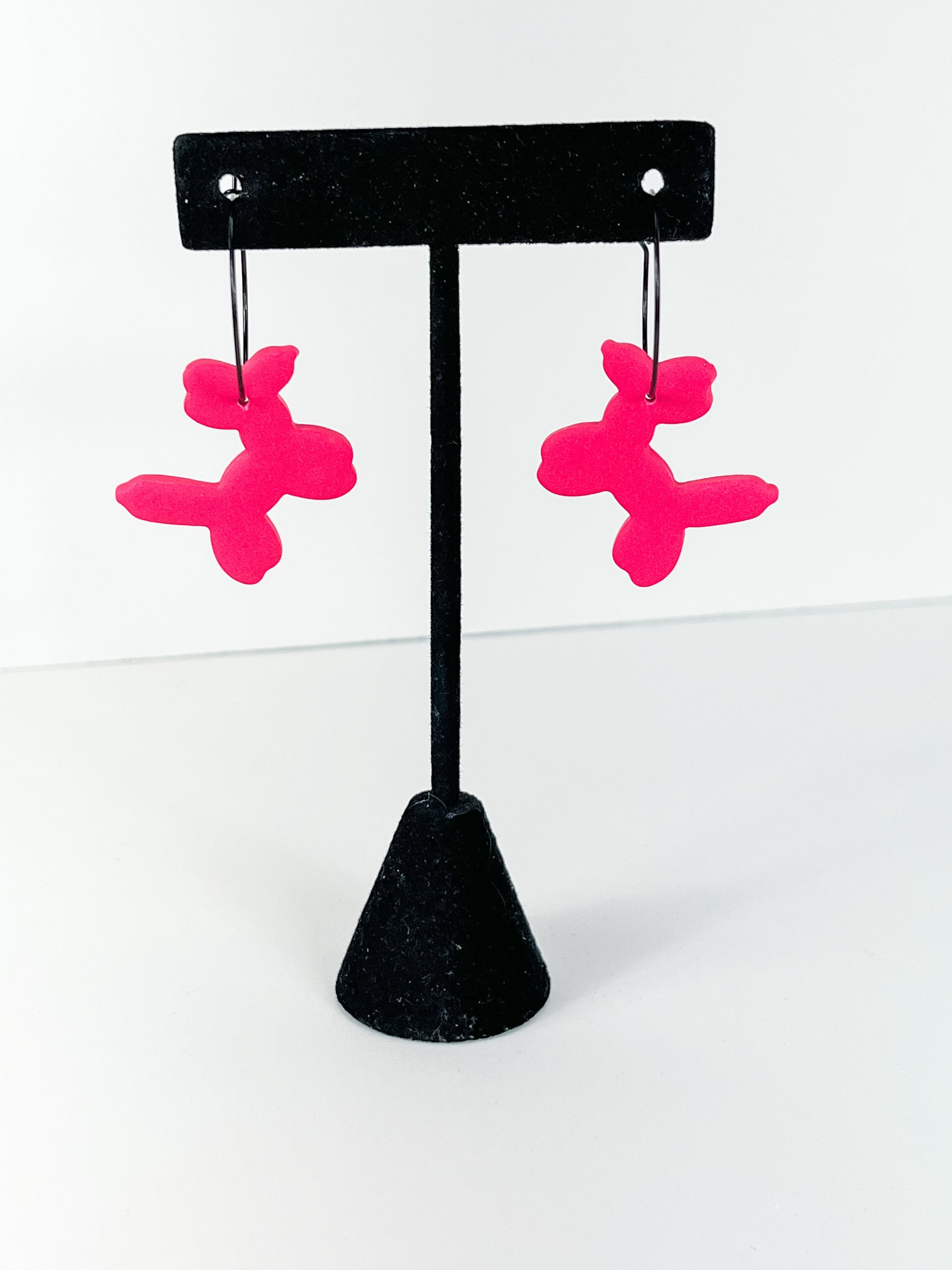 Hot pink balloon dog polymer clay earrings on black hoop. Earring length is approximately 1.5 inches.