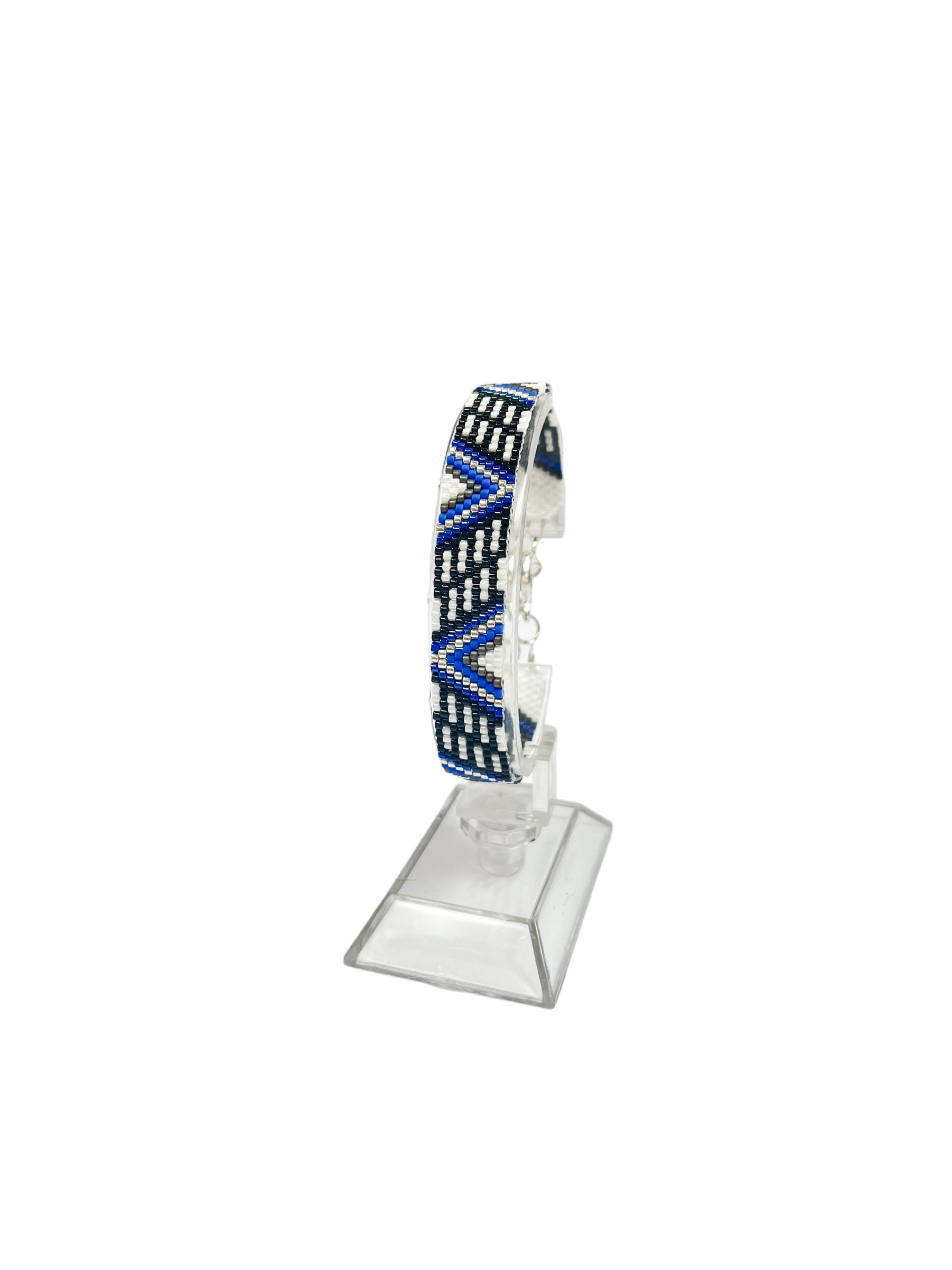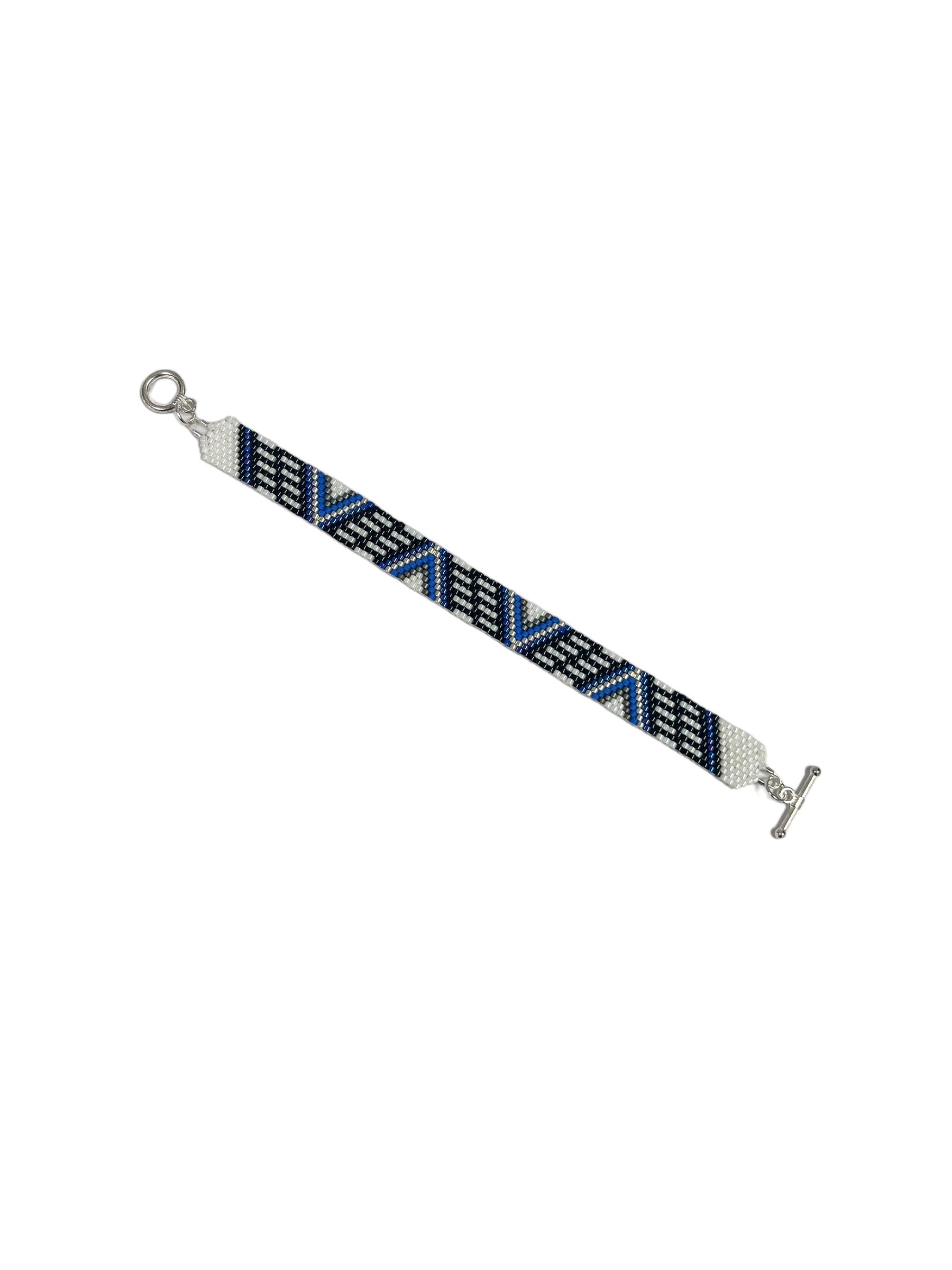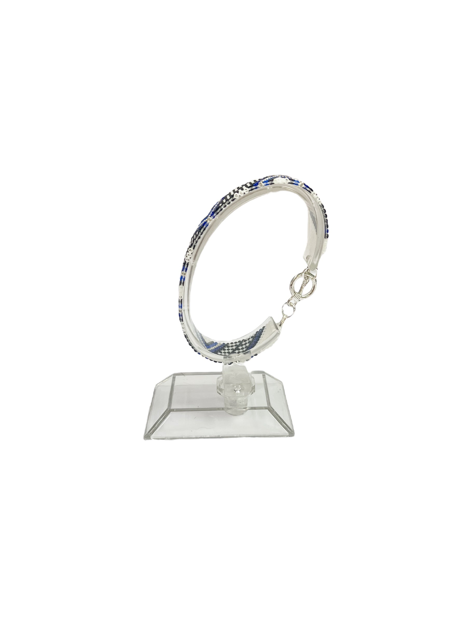 Black, white and blues beaded bracelet with an easy bar and circle clasp. Bracelet length is approximately 7 inches. Please add a note to your order if you need the bracelet extended.