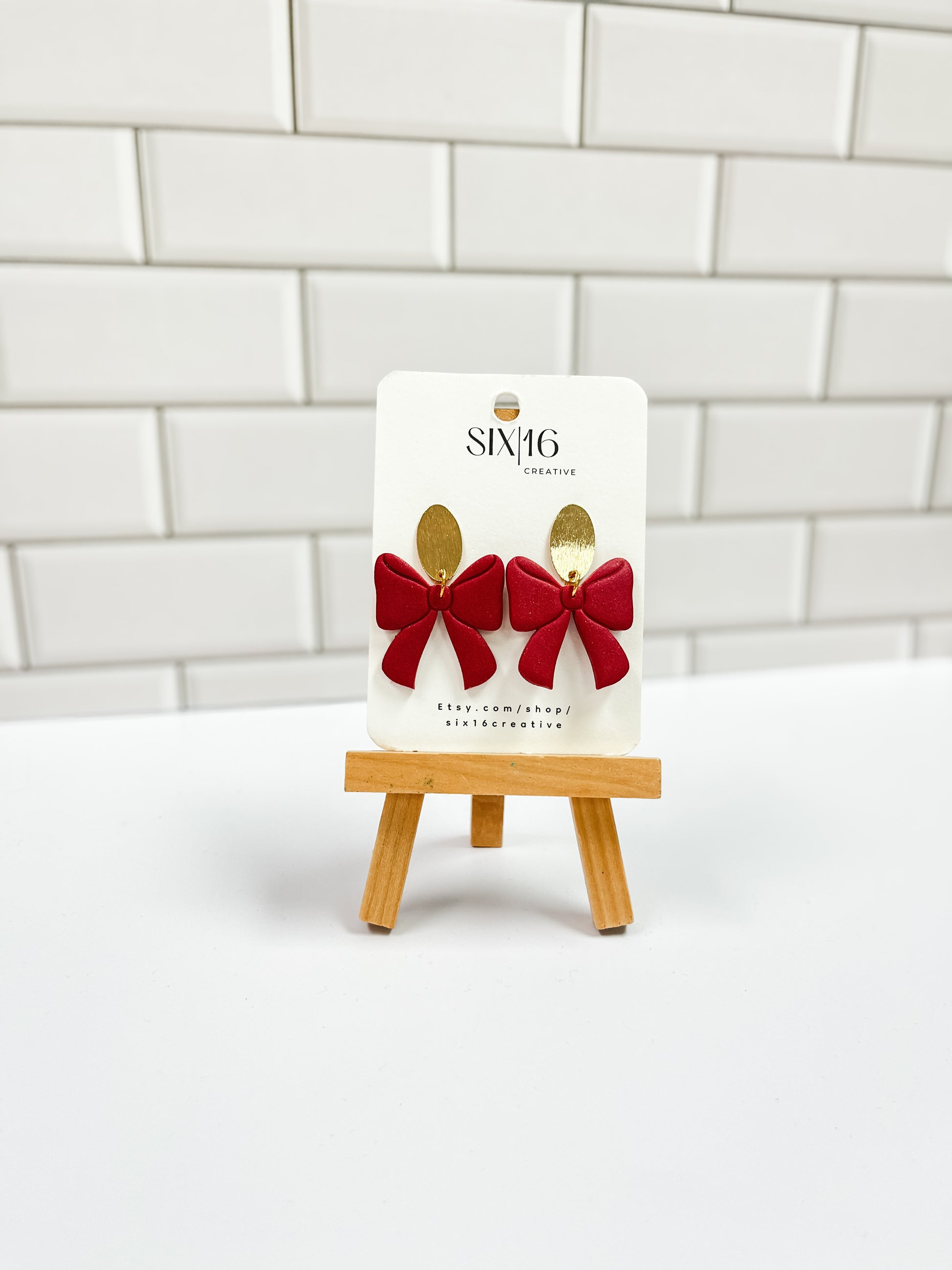 Dark red bow with shimmer clay earrings with a textured gold oval. Earring length is approximately 1.75 inches.
