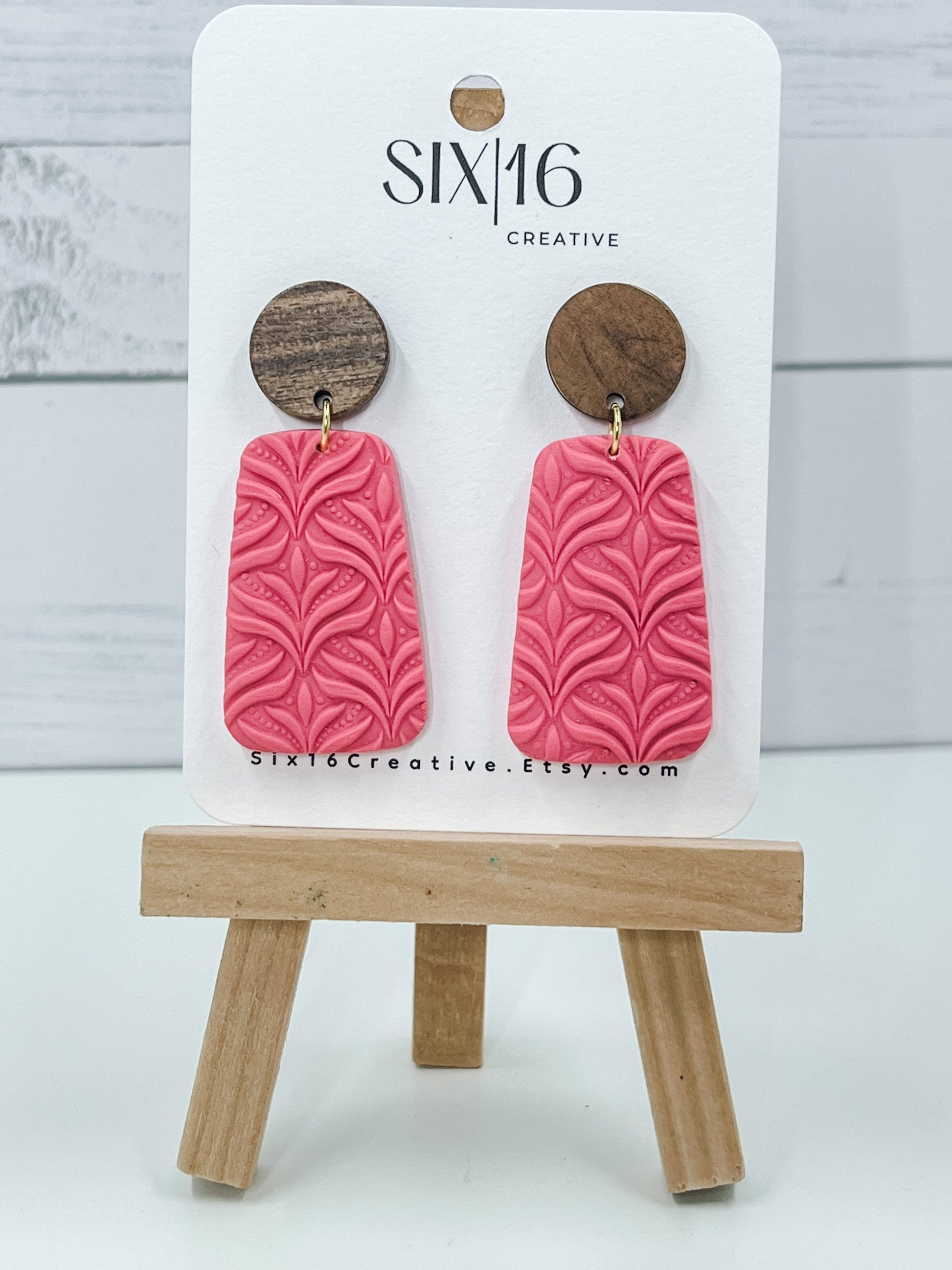 Coral polymer clay earrings on a wooden and stainless steel post. Earring length is approximately 1.75 inches.