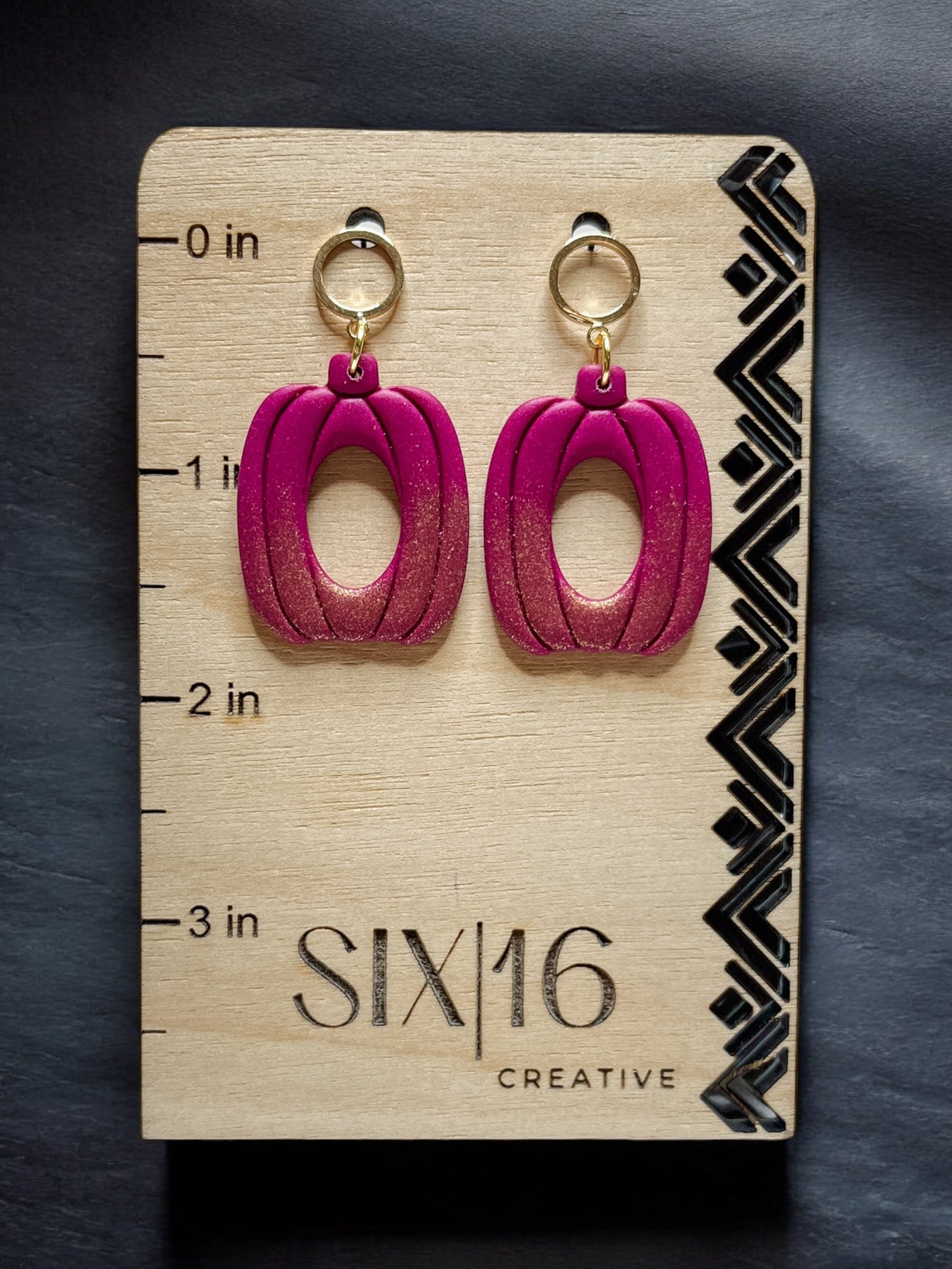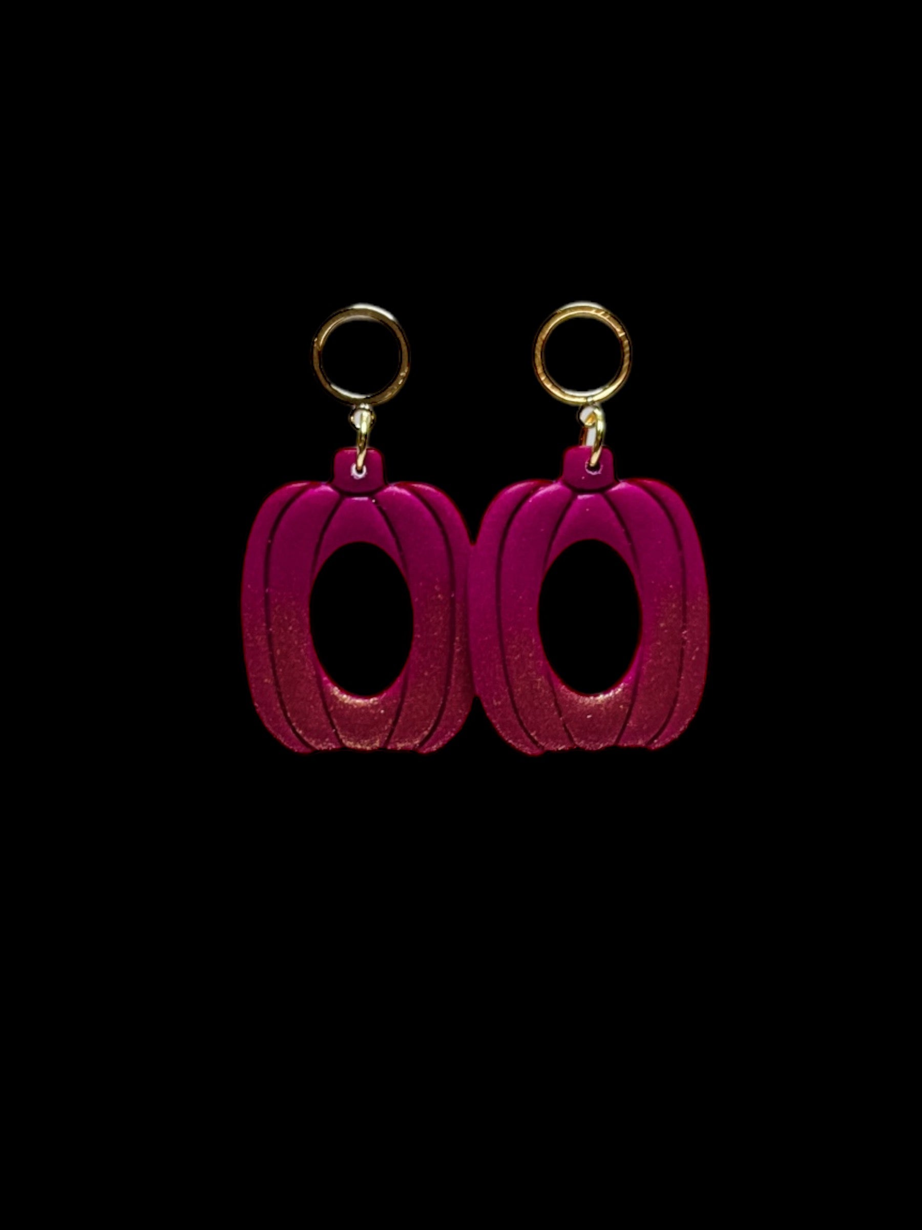 Dark pink pumpkin polymer clay earrings with a gold shimmer on a stainless steel gold circle post. Earring length is approximately 1.75 inches.
