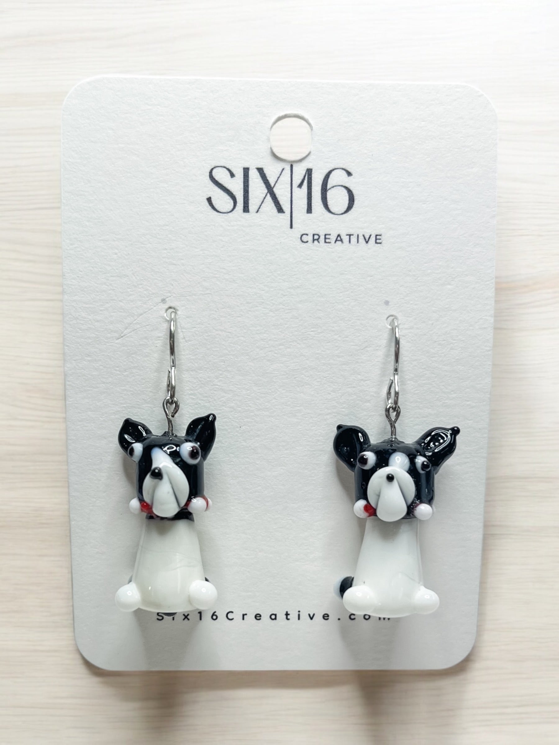 Dog glass bead earrings on stainless steel silver hook. Earring length is approximately 1.5 inches.