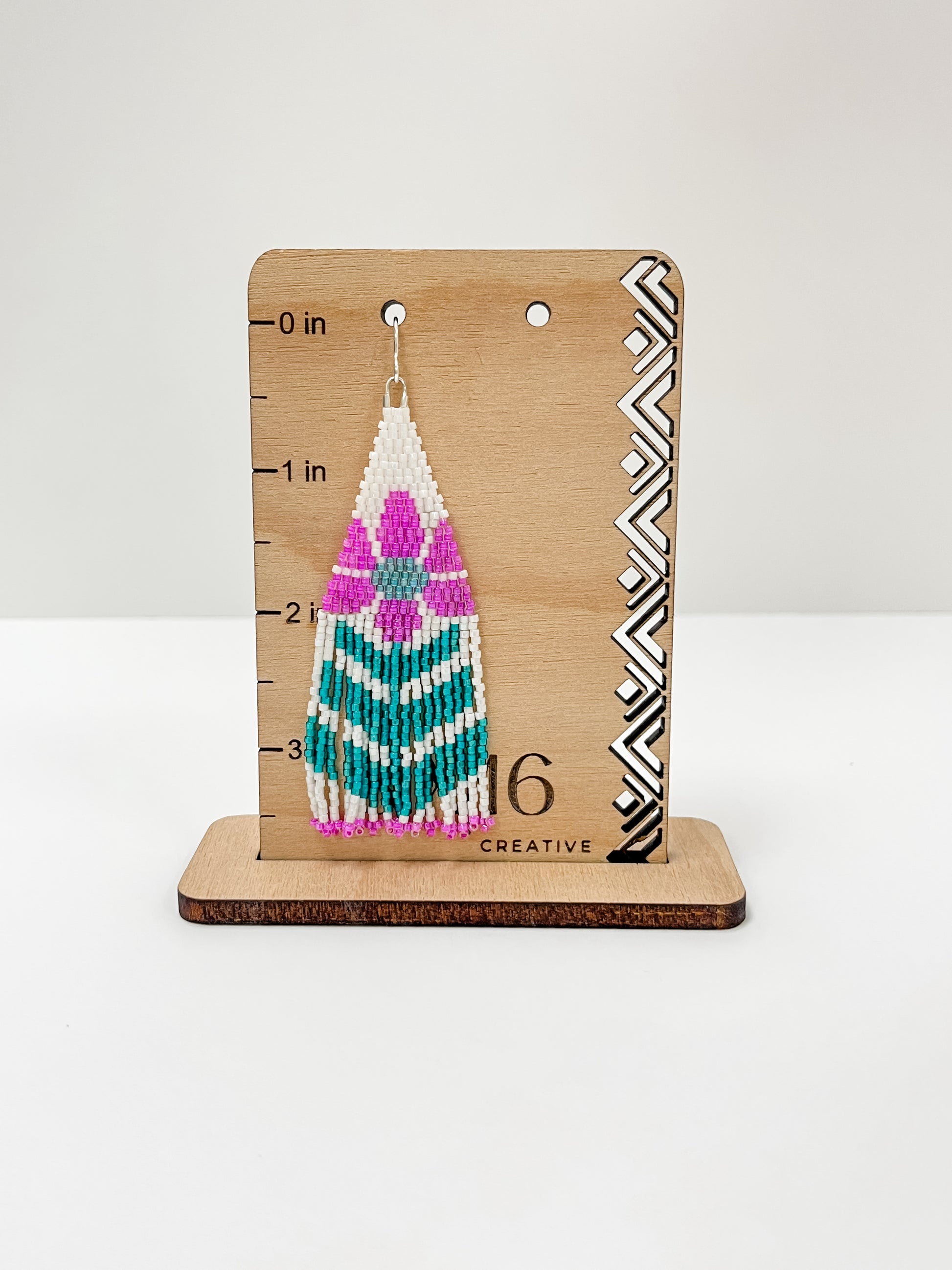 White, teal and purple beaded fringe earrings. The length is approximately 3 inches.