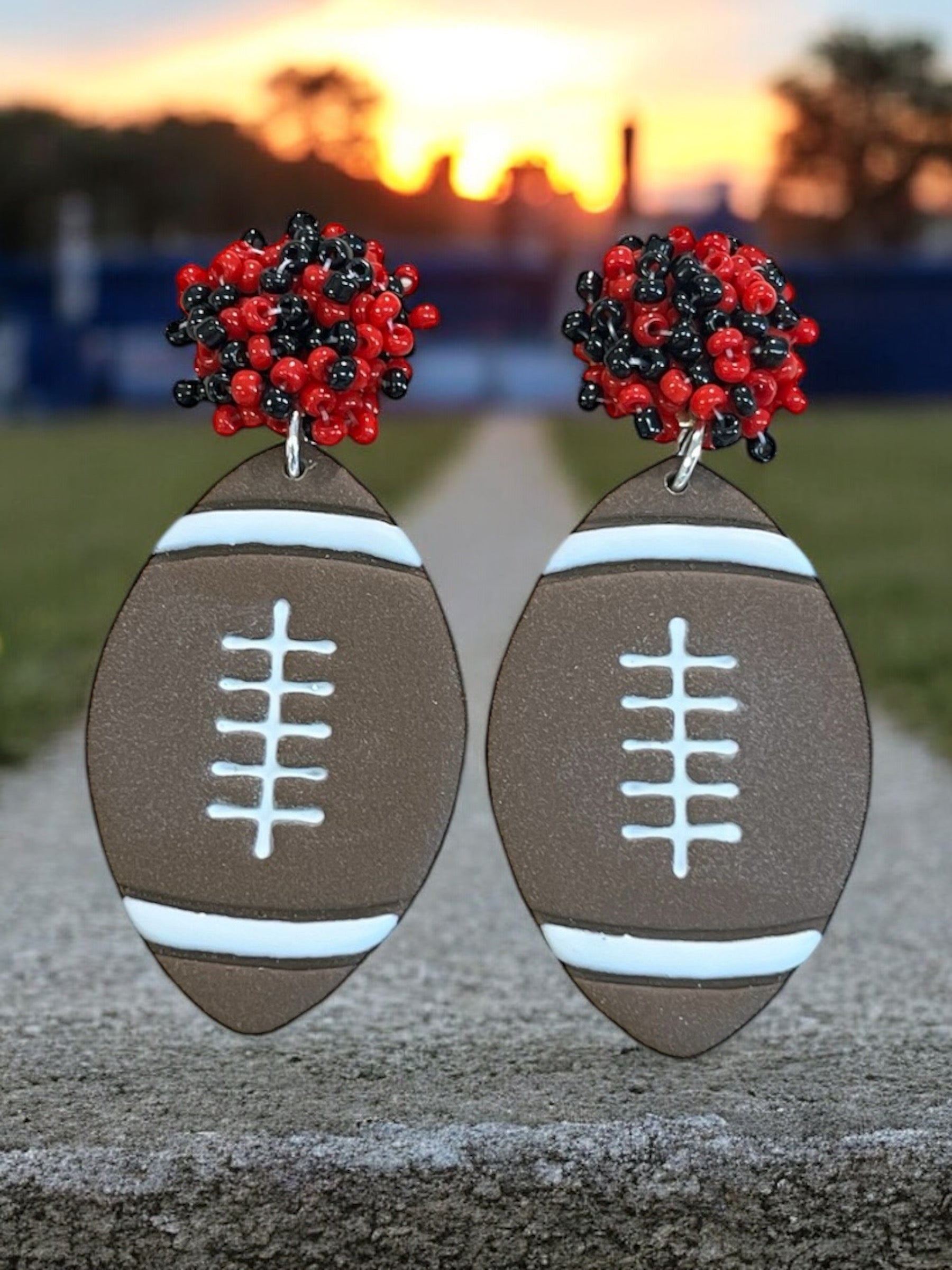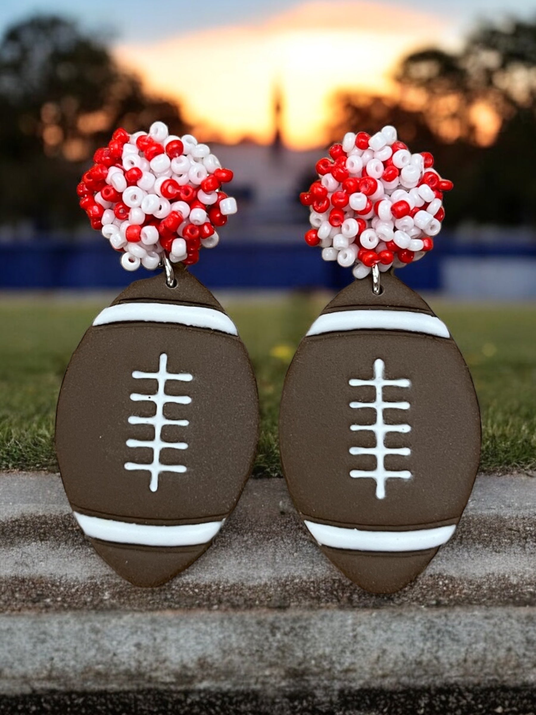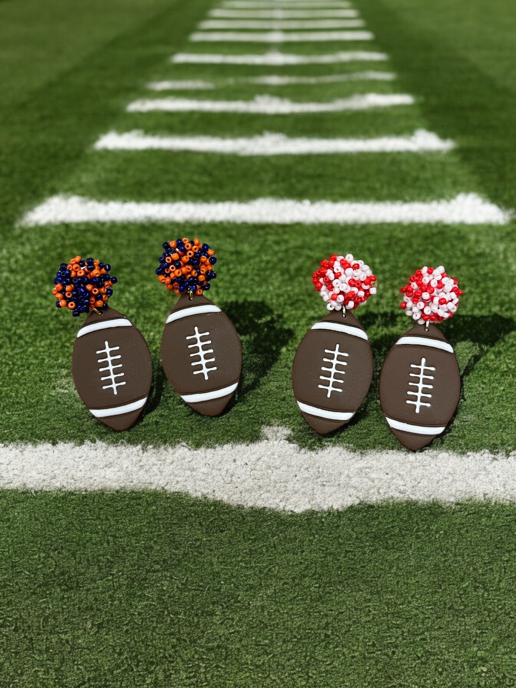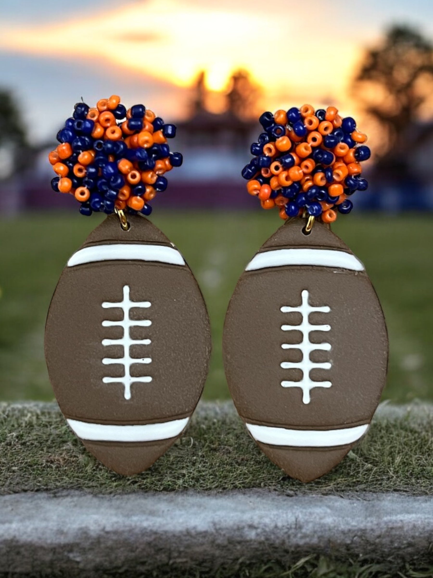 Football polymer clay earrings on a stainless steel beaded post. Earring length is approximately 3 inches.