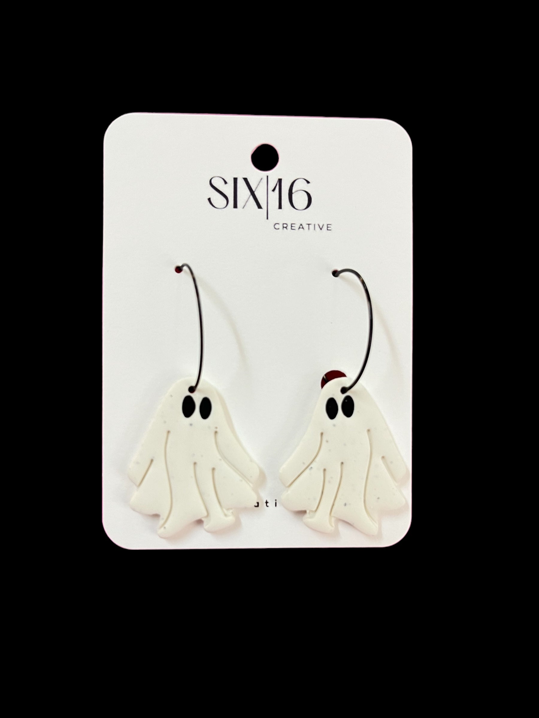 White ghost polymer clay earrings on a black hoop. Earring length is approximately 2 inches.