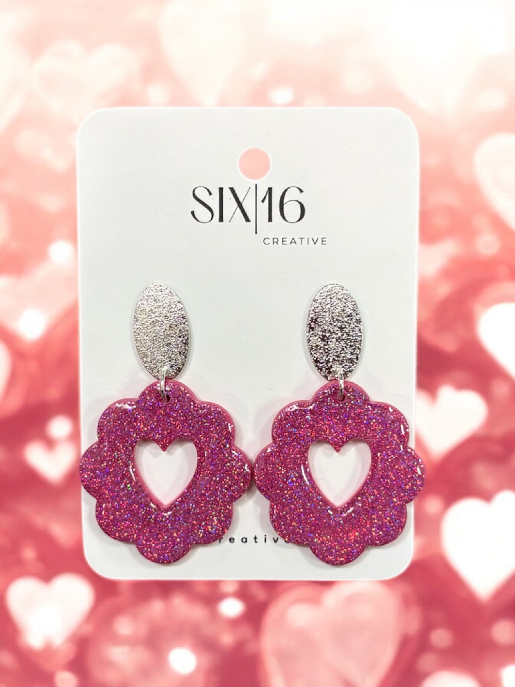 Pink glitter scallop heart polymer clay earrings on a stainless steel silver oval. Earring length is approximately 2 inches.
