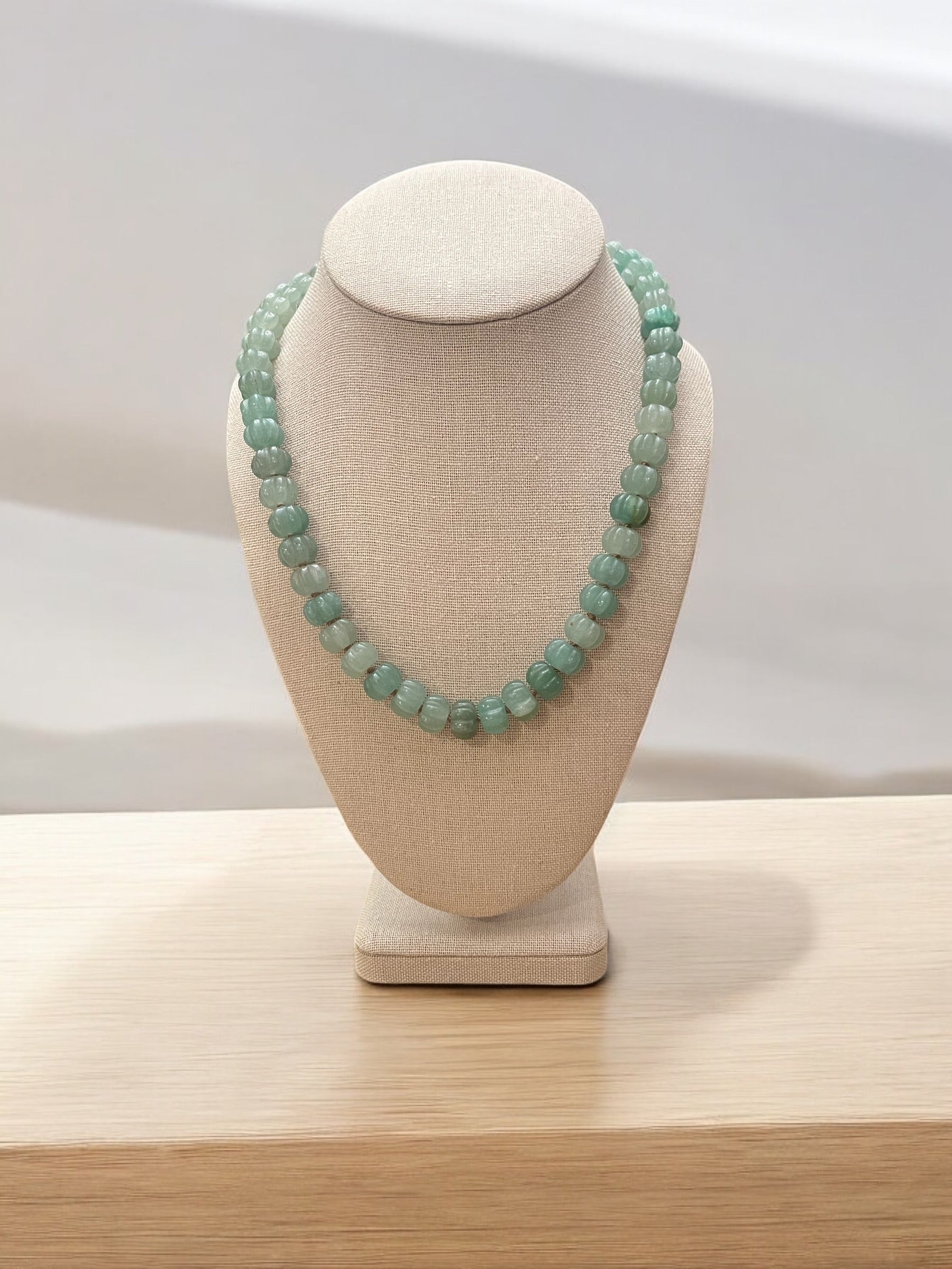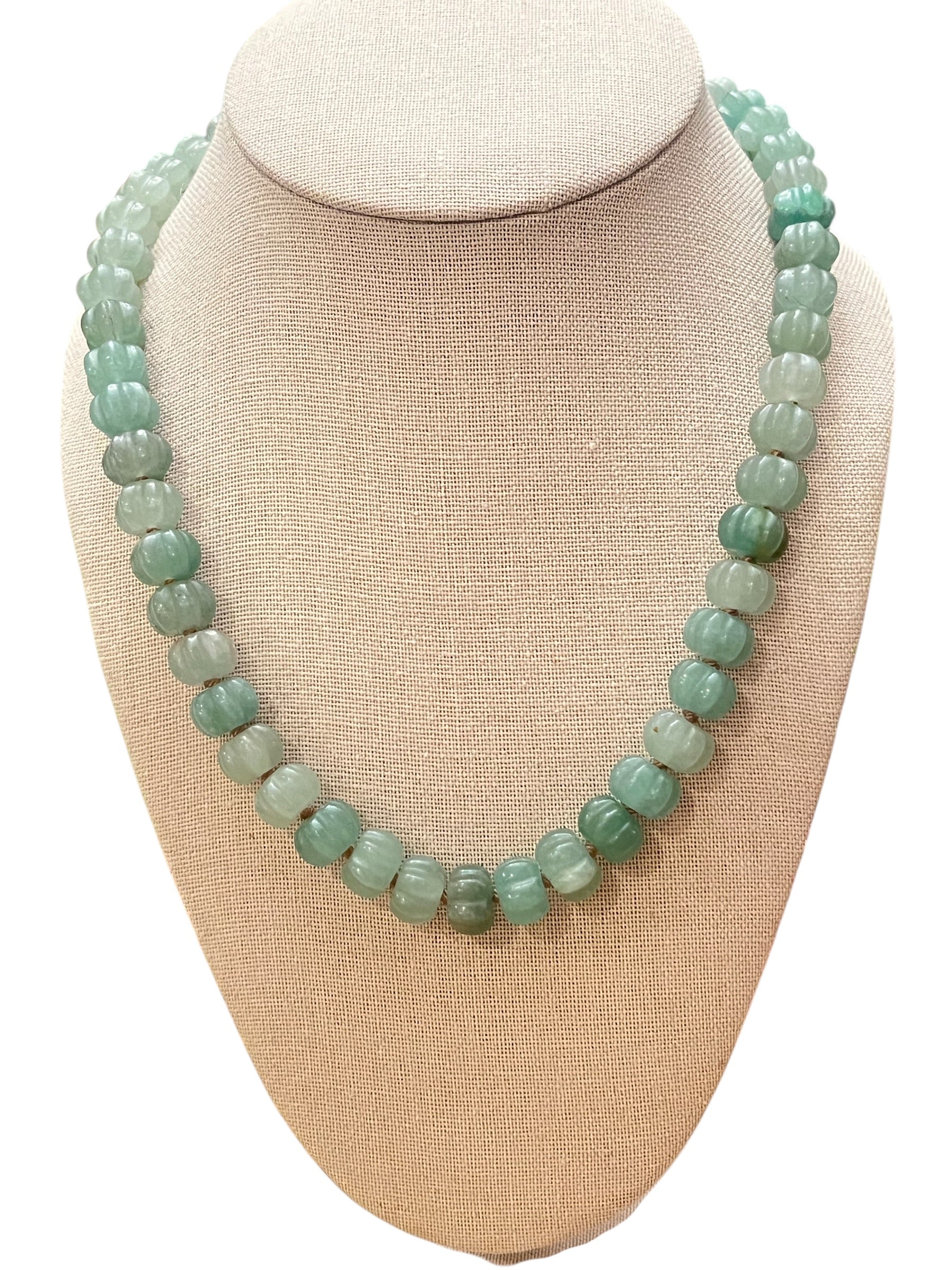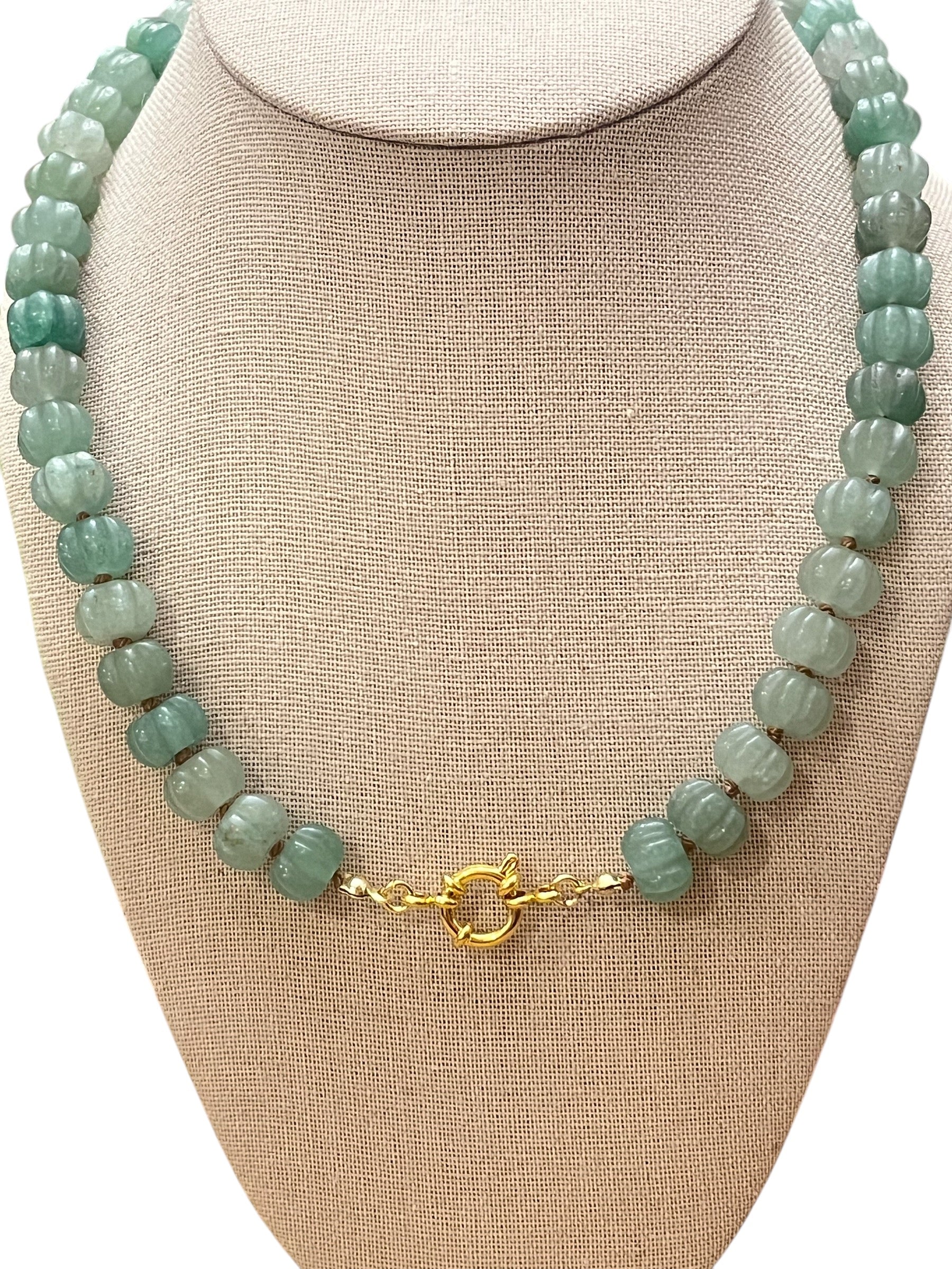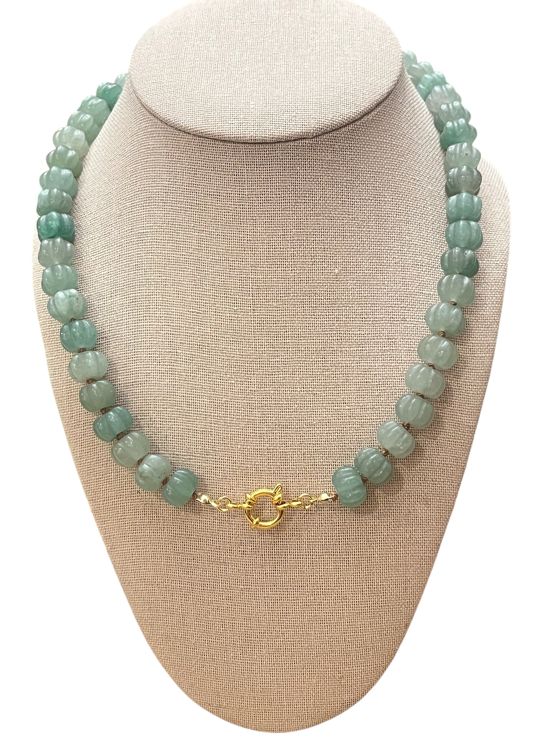 This green necklace features gorgeous green aventurine pumpkin gemstone beads that are hand knotted onto a beige silk thread. The necklace comes together with an 18k gold decorative clasp that can be worn in the front, on the side or the back.