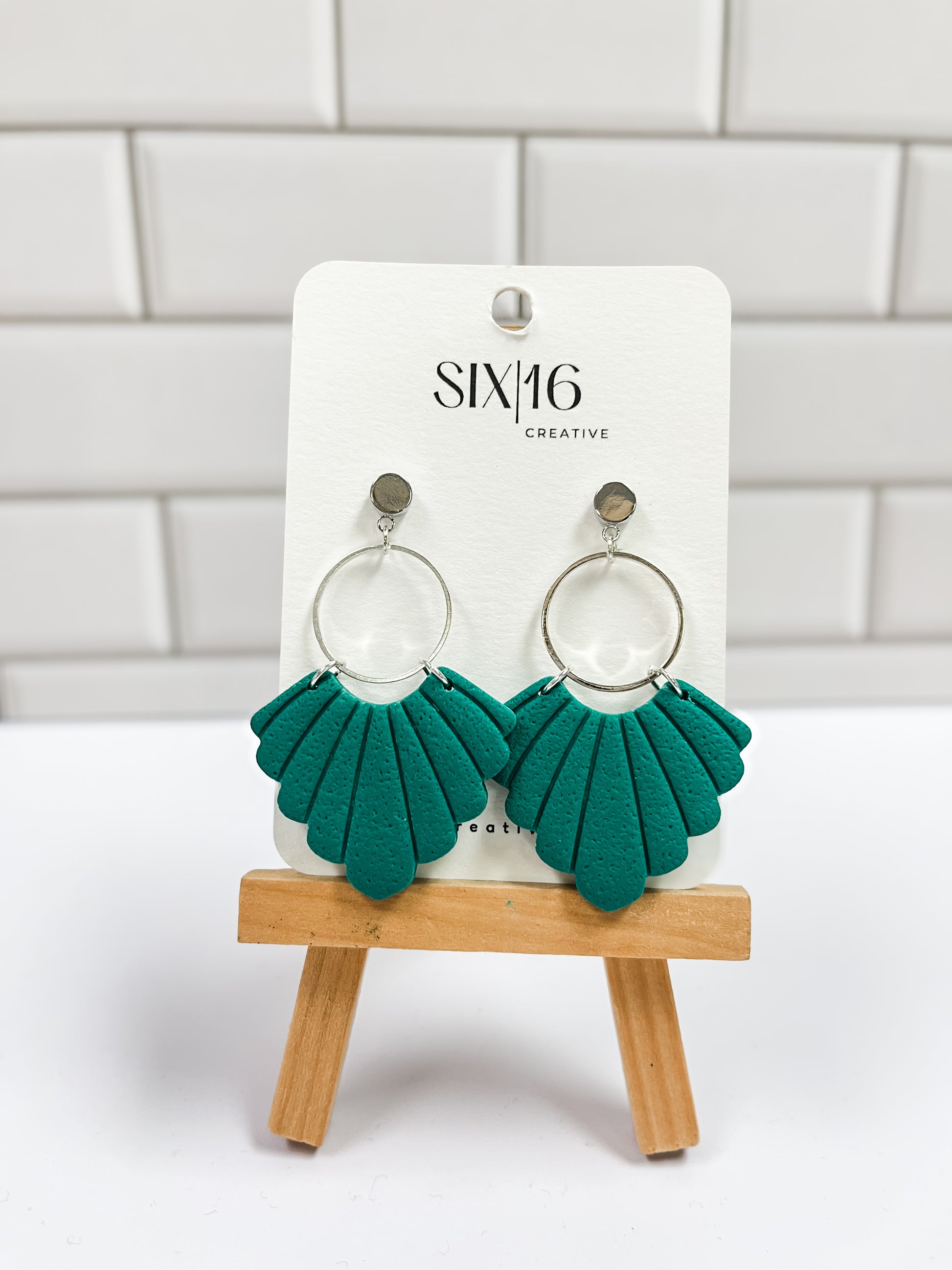 Green fan polymer clay earrings with a silver ring on a silver post. Earring length is approximately 2.25 inches.