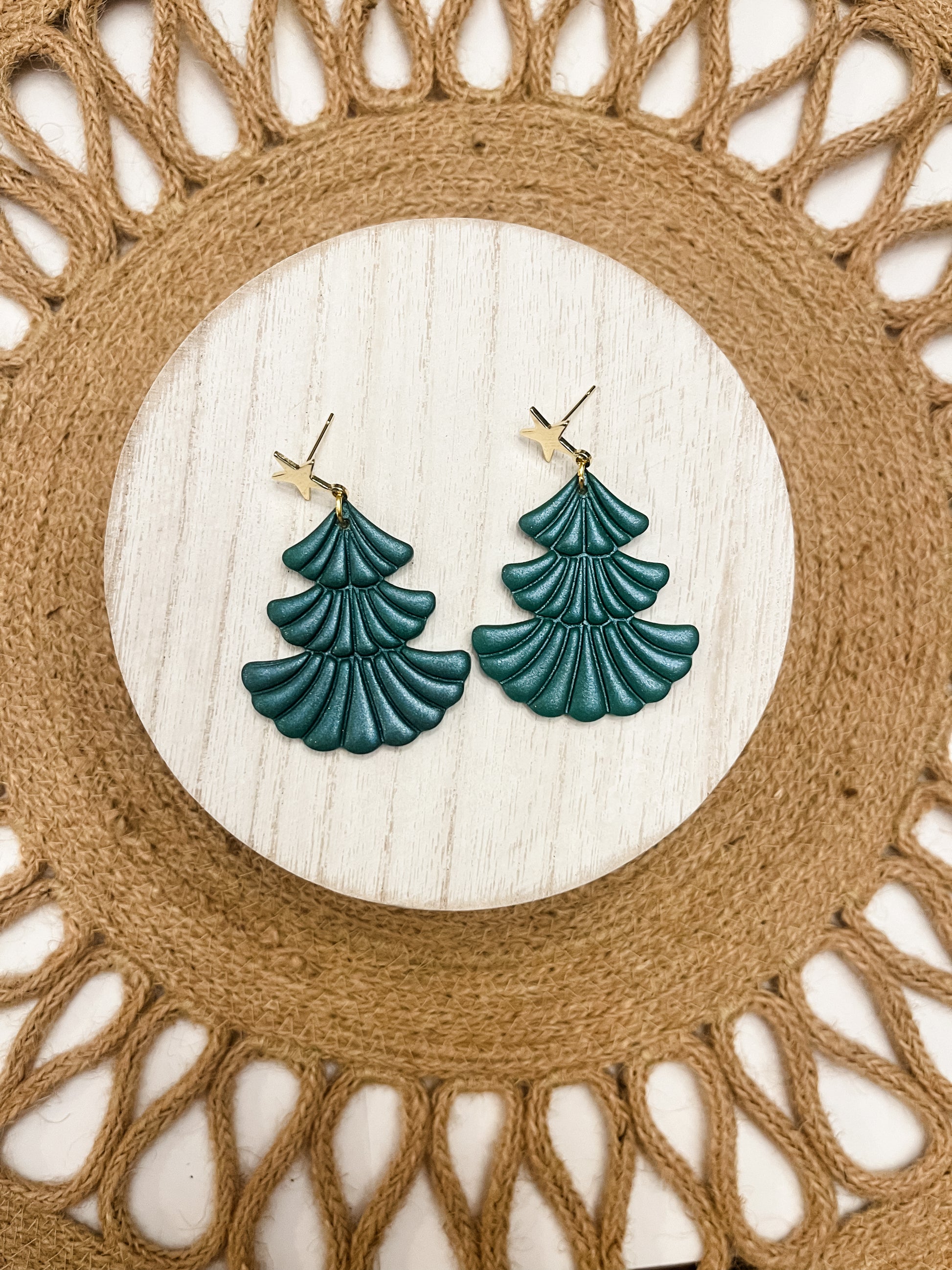 Shimmer green frilly Christmas tree polymer clay earrings on a gold star post. Earring length is approximately 2 inches.