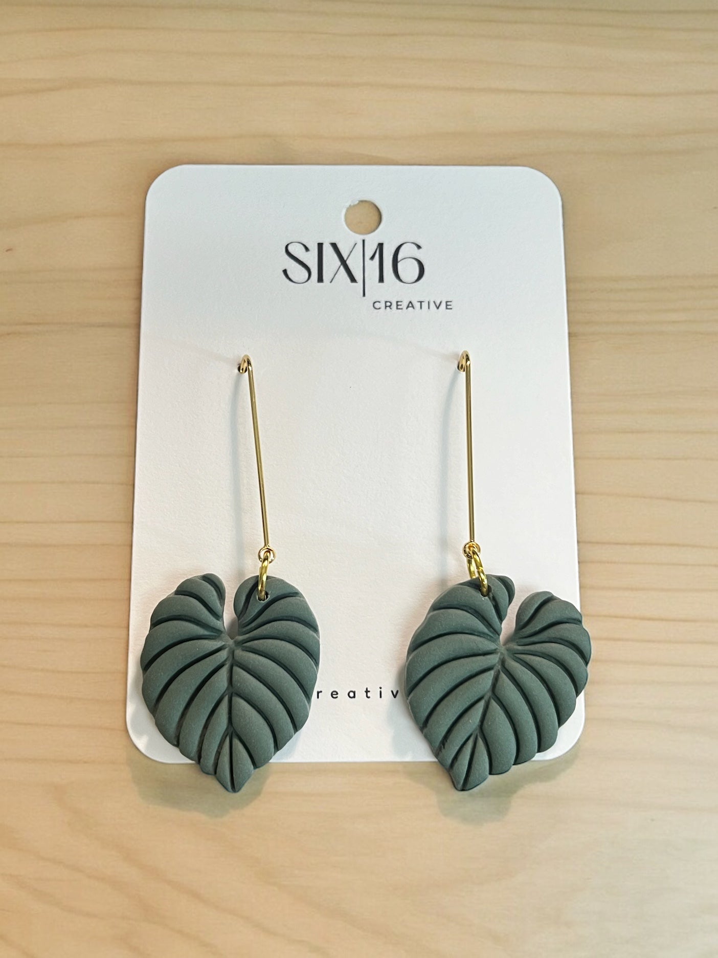 Green philodendron leaf polymer clay earrings on a long gold stainless steel hook. Earring length is approximately 2.25 inches.