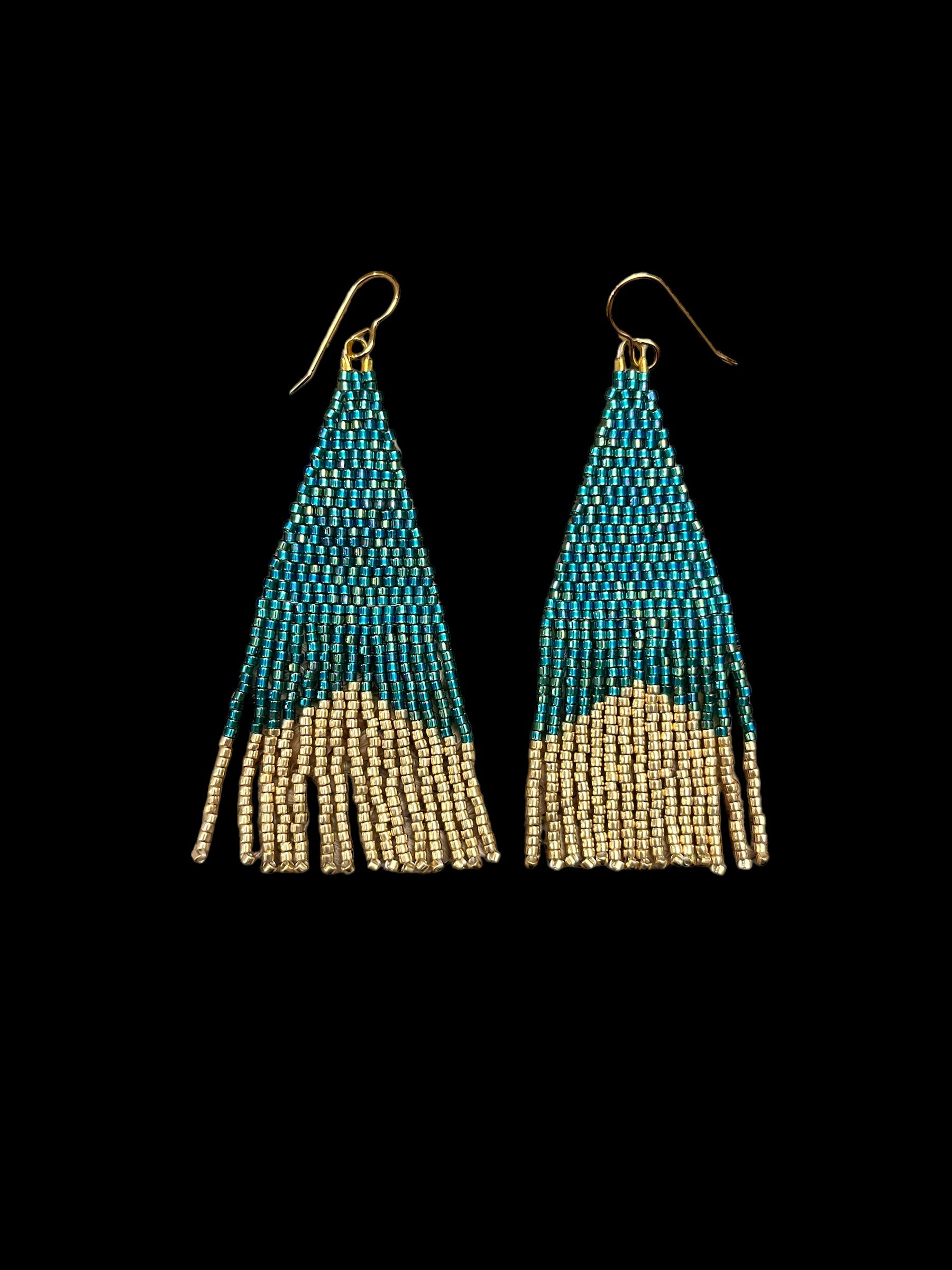 Handmade green beaded earrings with gold fringe. The length is approximately 3 inches.