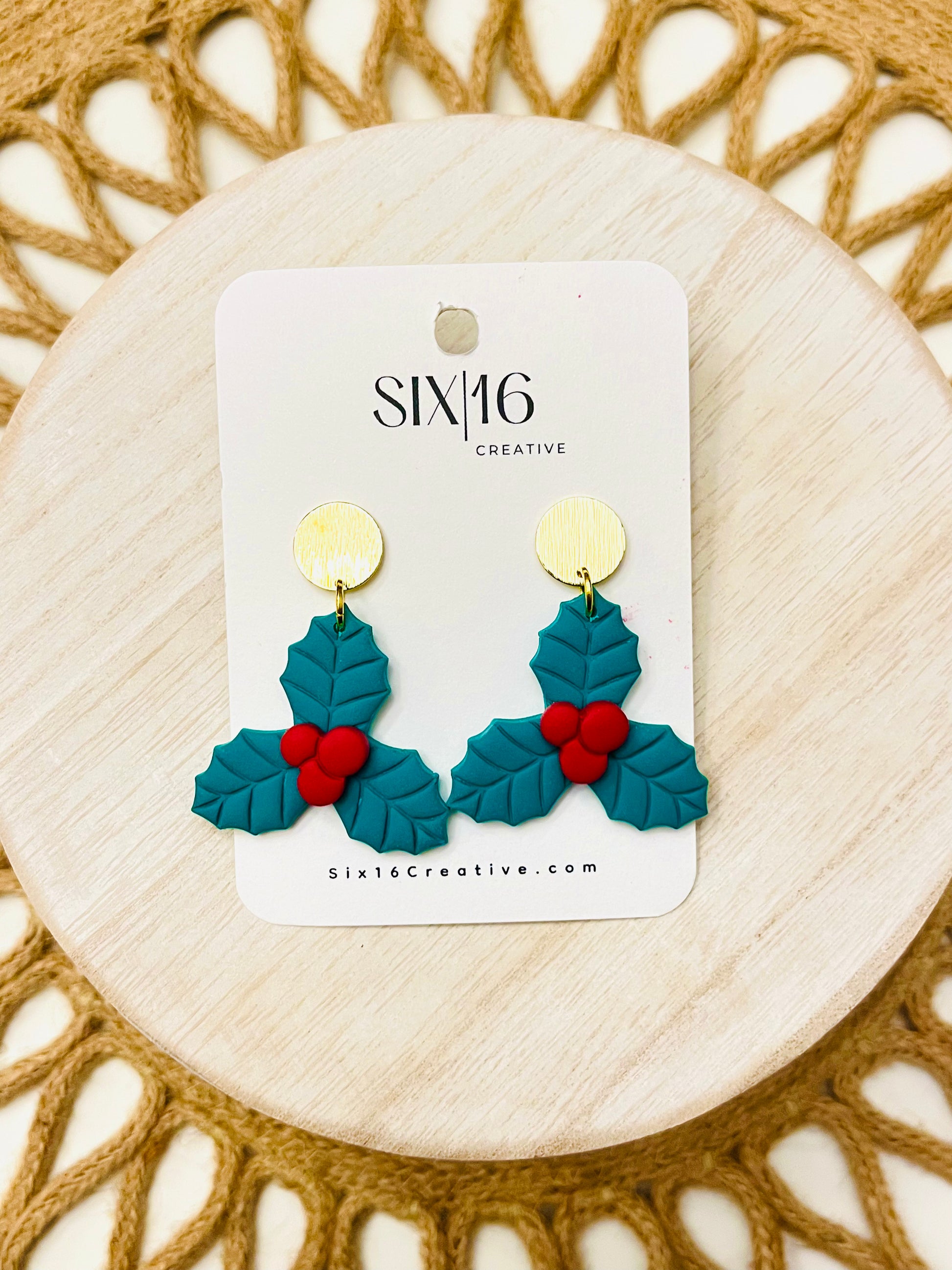 Holly leaves polymer clay earrings on a gold post. Earring length is approximately 2 inches.