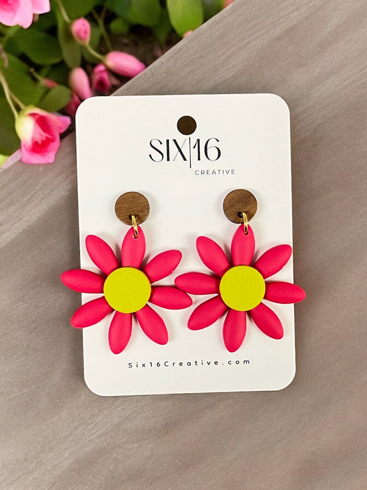 Hot pink flower with lime green center polymer clay earrings on a small wooden circle with a stainless steel post. Earring length is approximately 2 inches.