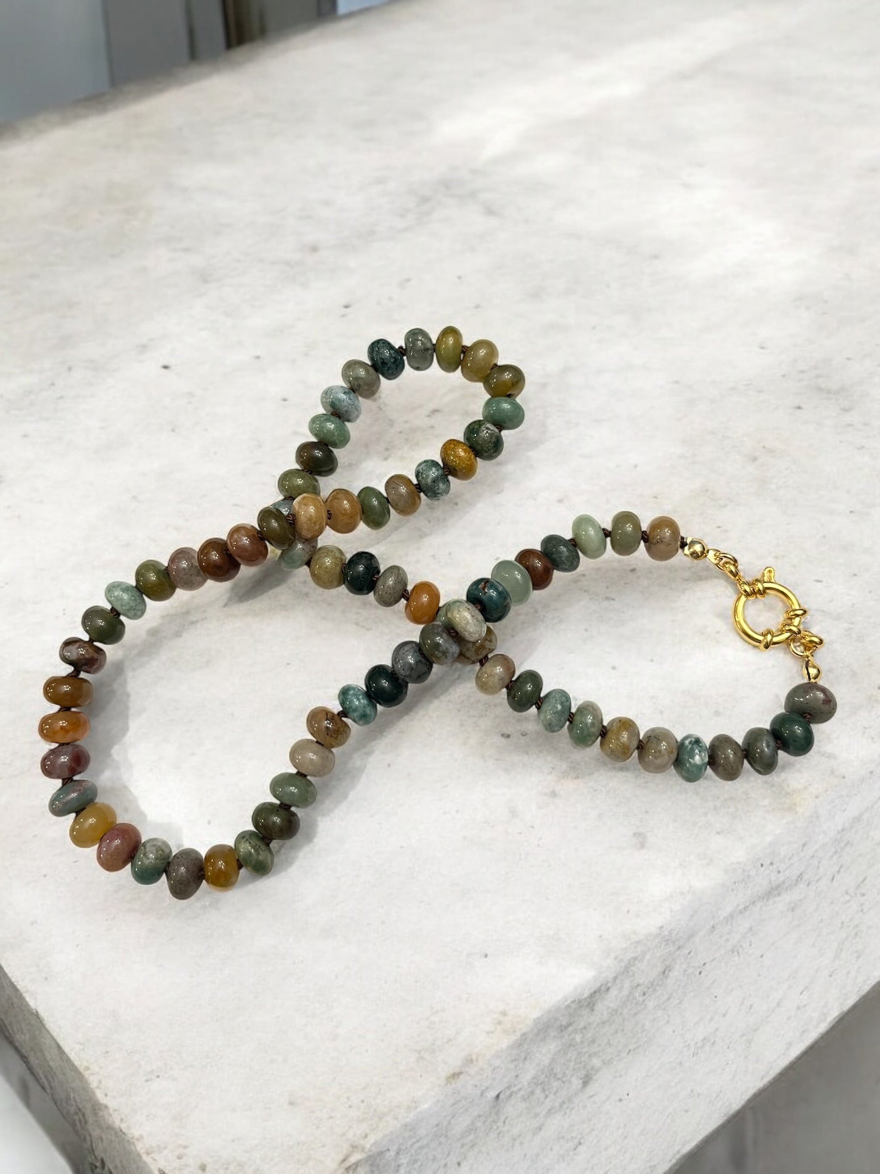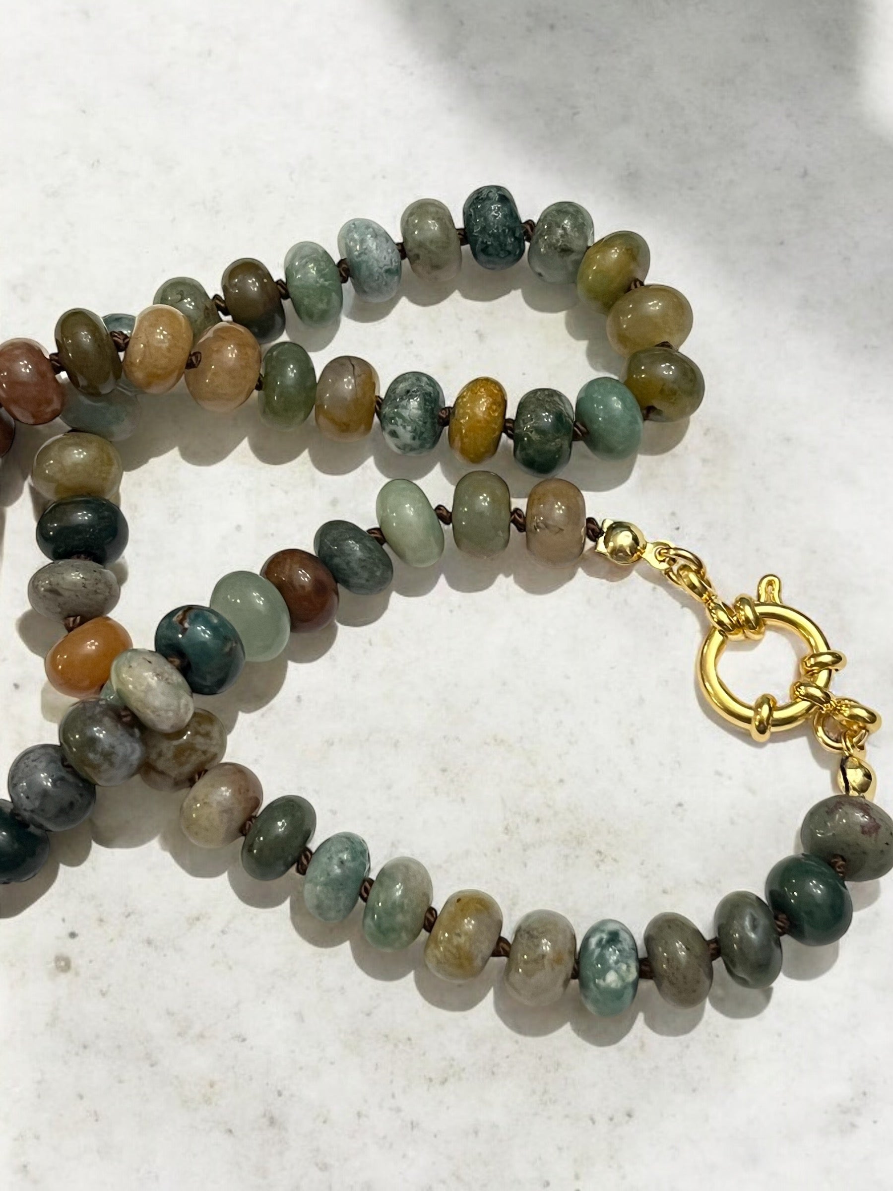 This green and tan necklace features gorgeous India Agate gemstone beads that are hand knotted onto a dark brown silk thread. The necklace comes together with an 18k gold decorative clasp that can be worn in the front, on the side or the back.