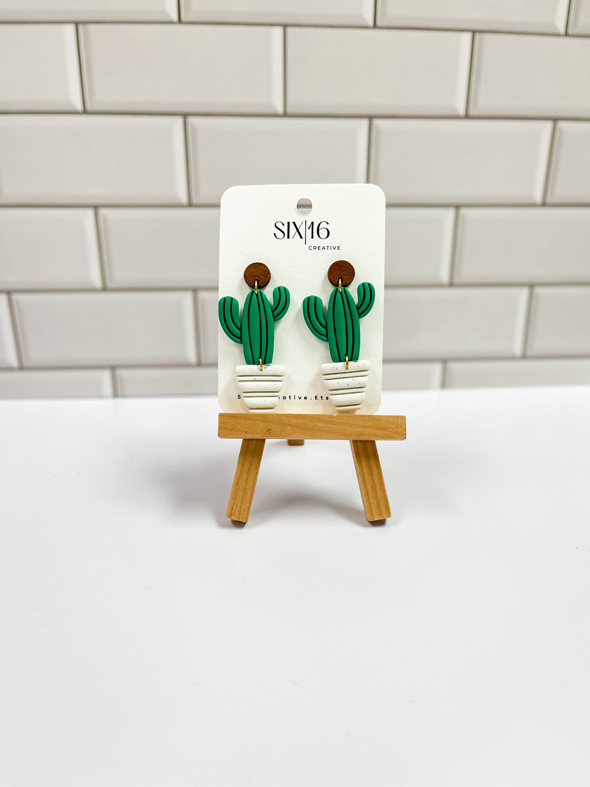 Green cactus clay earrings on a stainless steel post. Earrings are 2 inches long.