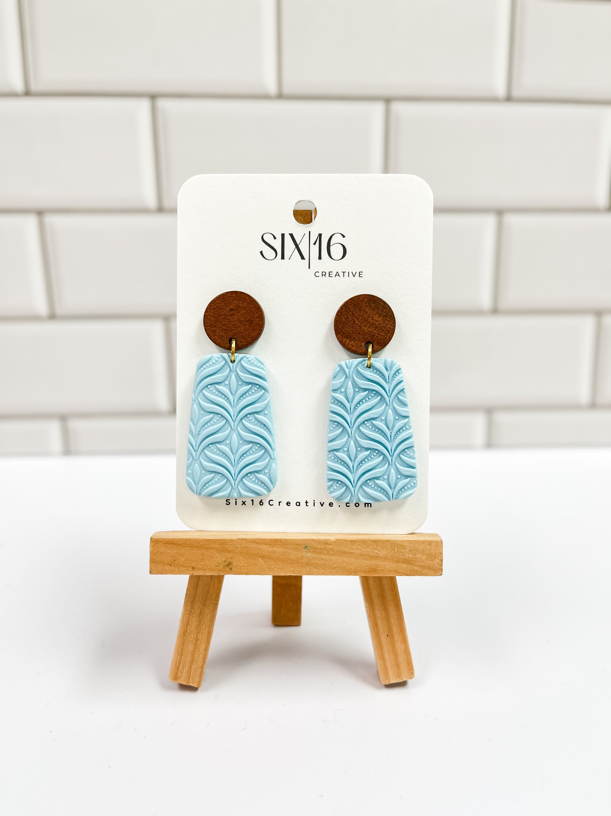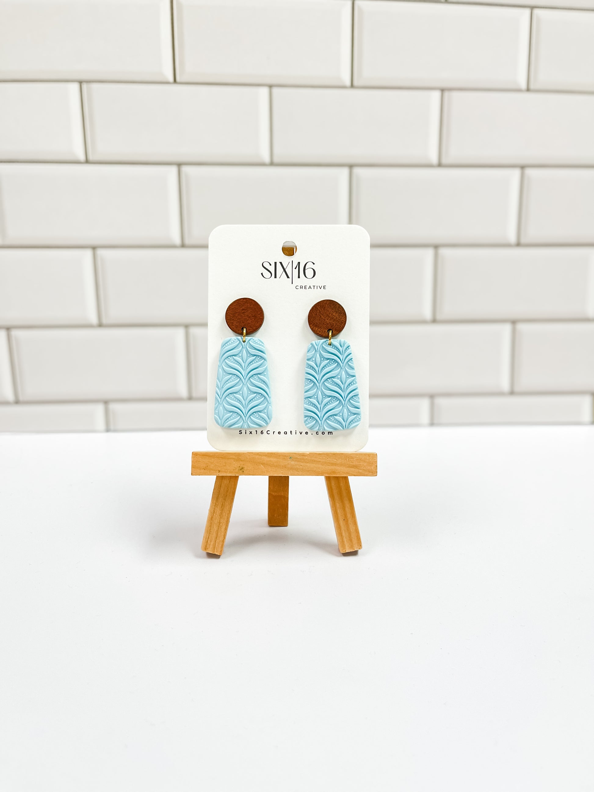 Light blue polymer clay earrings on a wooden and stainless steel post. Earring length is approximately 1.75 inches.