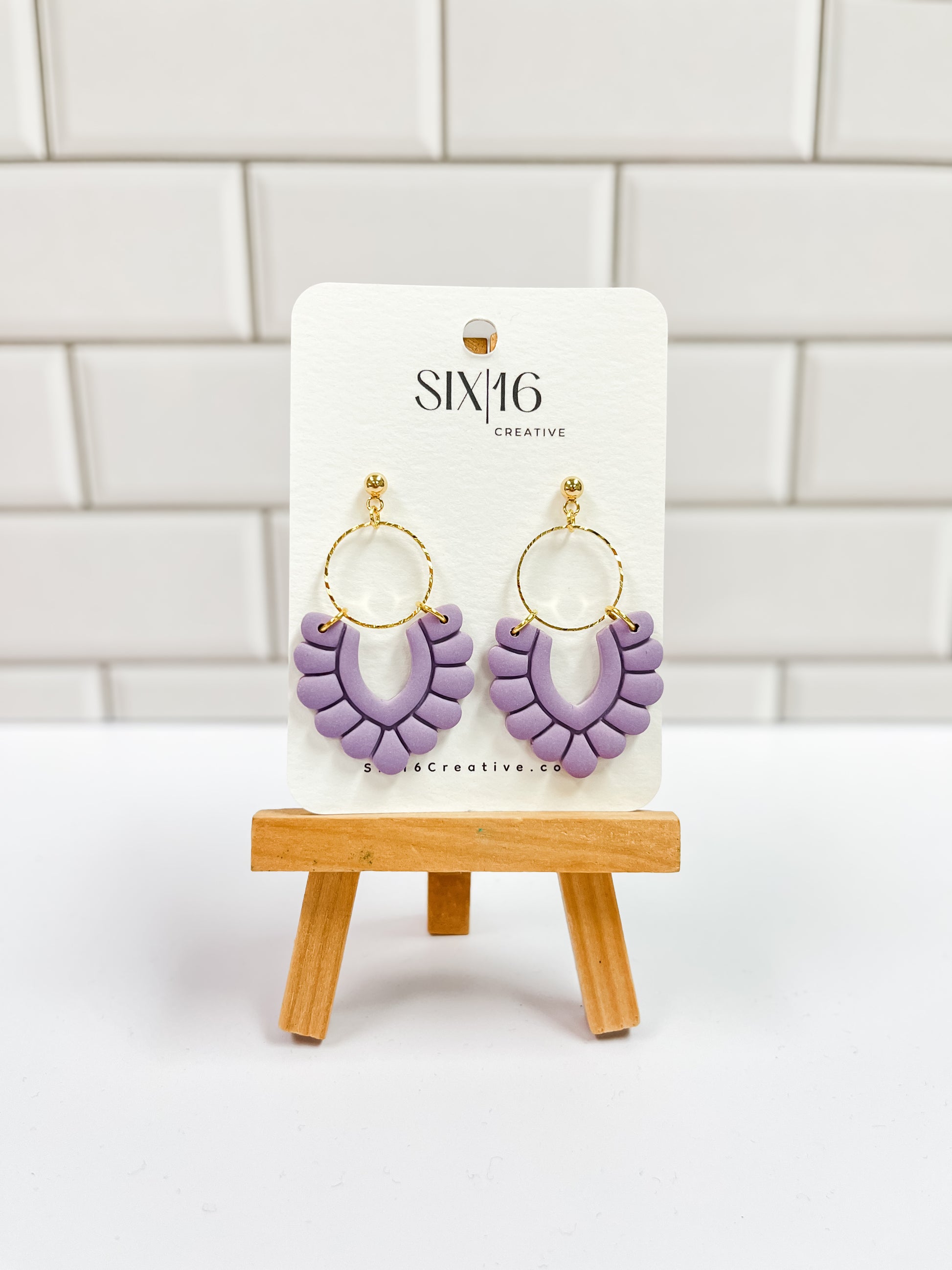 Lilac scalloped U polymer clay earrings on a gold stainless steel ball post. Earring length is approximately 2 inches.