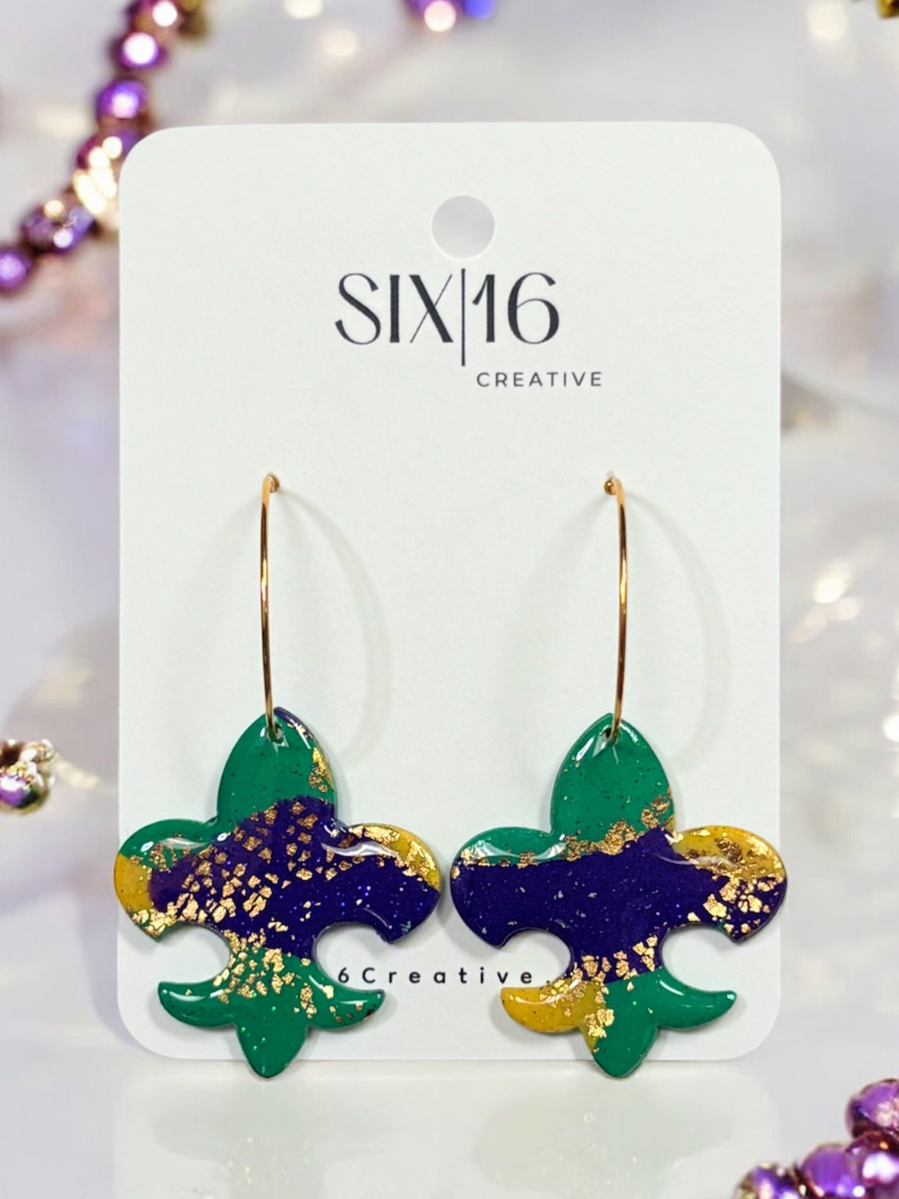 Purple, green and gold Mardi Gras polymer clay earrings on a gold hoop. Earring length is approximately 2.25 inches.