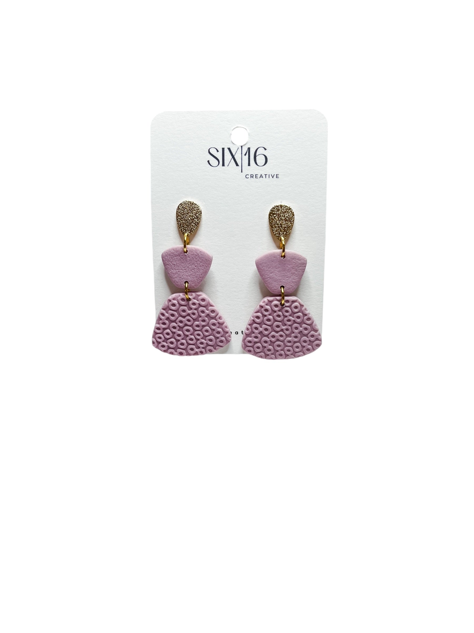 Mauve polymer clay earrings on a gold teardrop post. Earring length is approximately 2 inches.