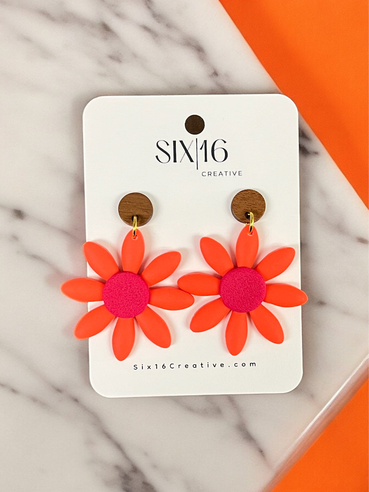 Neon orange flower with pink center polymer clay earrings on a small wooden circle with a stainless steel post. Earring length is approximately 2 inches.