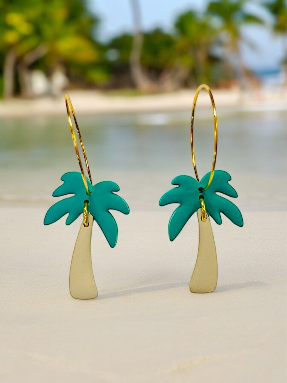 Palm tree polymer clay earrings on a 25mm gold stainless steel hoop. Earring length is approximately 1.5 inches.
